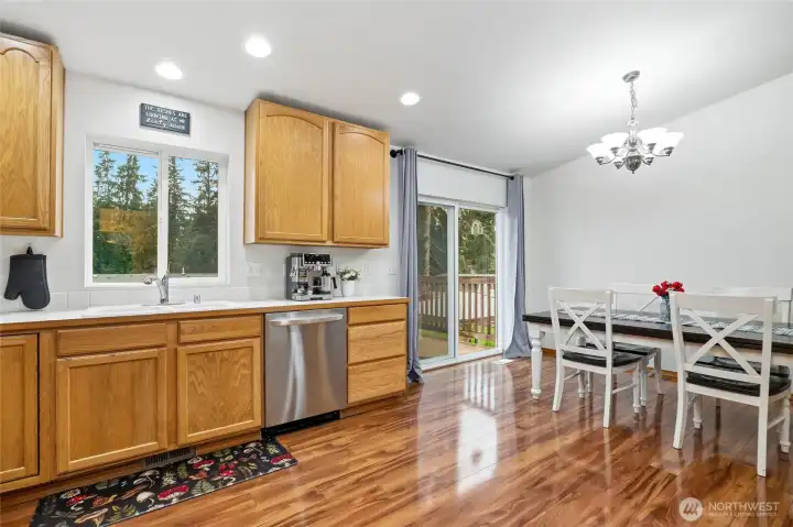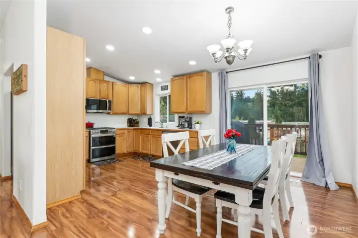 Open living and dining spaces are perfect for family gatherings. The slider leads out to the deck, ideal for barbecues and watching backyard activities.