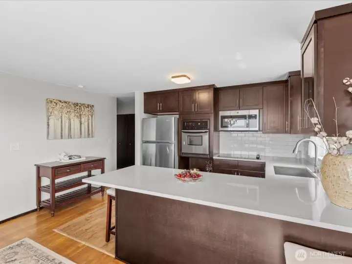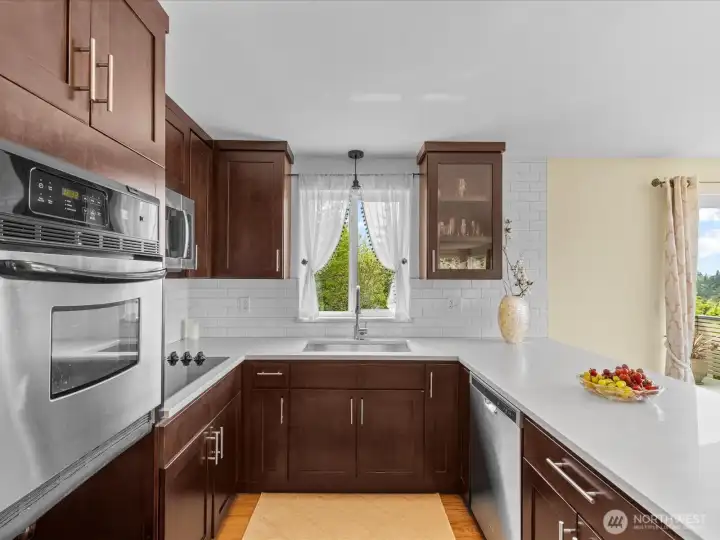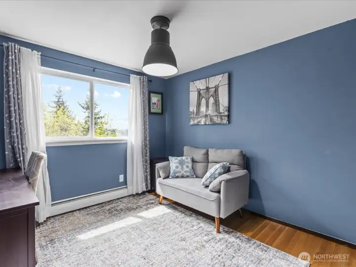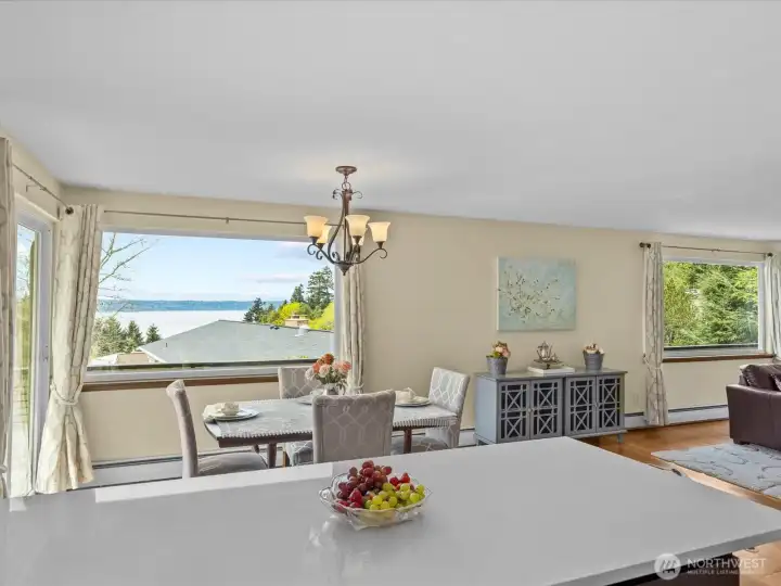 This immaculate and impeccable home is a mid-century modern masterpiece located in the coveted Hurstwood neighborhood of Seahurst. It offers expansive views of the Puget Sound, Olympic Mountains, and legendary sunsets. Updated for today's living, the versatile 6-bedroom, 3-bathroom floorplan is ideal for multigenerational living or rental income opportunities. Modern dual-level living that features a rare complete second kitchen on the lower level, perfect as a (MIL) unit or guest suite. Upstairs has a great room with a wall of windows that floods the space with natural light, showcasing the water and mountain views and a view deck. The designer kitchen adjoins an elegant dining room and is finished with modern quartz counters, stainless appliances, and a classic farm-style sink. The primary suite boasts a gorgeous primary bath with a spacious, over-sized shower. Creative Flex Space: a unique bedroom setup down includes a tucked-away sink and work area in the closet—ideal for craft room, or additional vanity station. All set on a quiet dead-end street with a large yard and RV parking. Hurstwood is a peaceful community renowned for its quiet residential charm and proximity to nature. Seahurst Park access is just a short distance away. This park is the jewel of Burien. It is a 178-acre park that offers 2,000 feet of saltwater beach, forest trails, and nature-inspired playgrounds. Must see home, view and location!