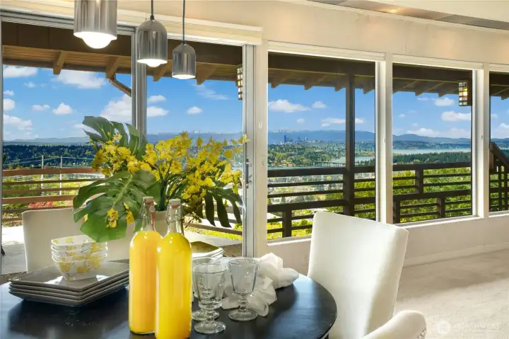 Welcome to this spectacular Somerset home with breathtaking panoramic views of Seattle, Bellevue, Lake Washington and the Olympics. Bring your imagination and Architect to create your own custom masterpiece. With 3,900 total SF to work with, the options are endless. Step through the double front doors onto the original slate floors into the open and inviting foyer. The living room features floor to ceiling windows which showcase the ever changing and dramatic views. Dining room features sliding glass door to the back deck, perfect for alfresco dining. The large kitchen is warm and inviting with a wood stove, island cooktop with bar seating and two built-in desks and breakfast nook. Custom built-ins throughout the library provides ample storage. Upper primary bedroom features a 5 piece ensuite bathroom and oversized walk-in closet. Lower level features primary bedroom with an ensuite bathroom, 2 additional bedrooms, 3/4 bathroom, spacious family room, laundry room and ample storage. Recent updates include a new 25 year roof installed in 2023 and a new electrical panel in 2026. Located within the high ranking Bellevue School District, zoned Somerset Elementary, Tyee Middle and Newport High School. The perfect location just minutes to I-405, I-90, shopping, restaurants, DT Seattle, Bellevue, and the airport.