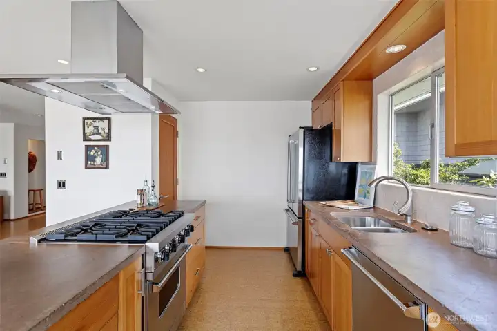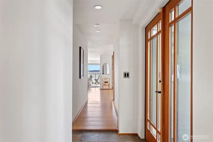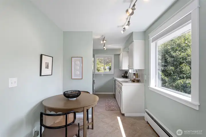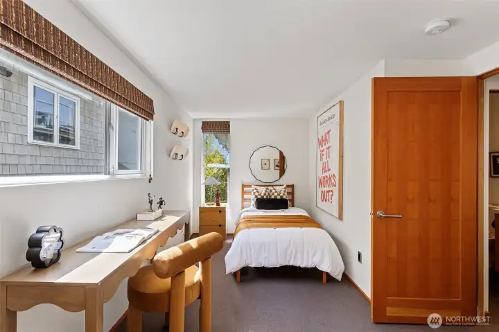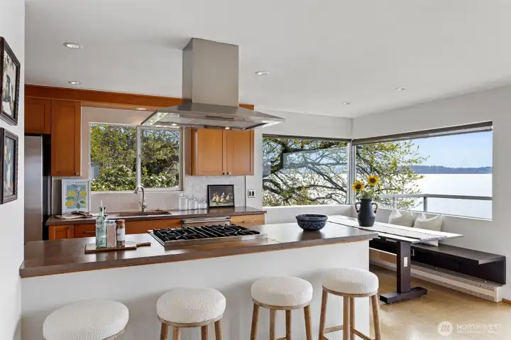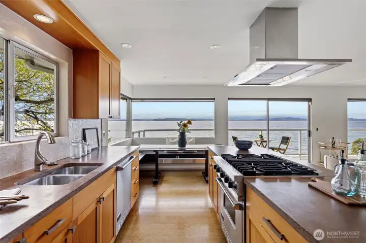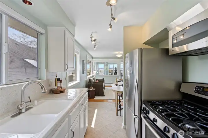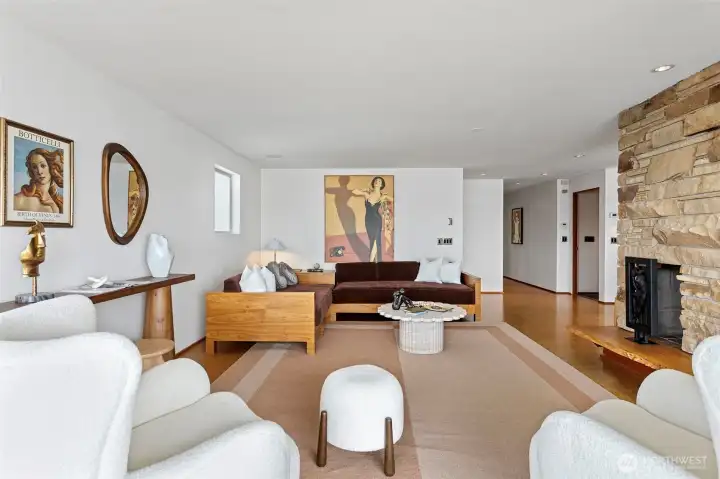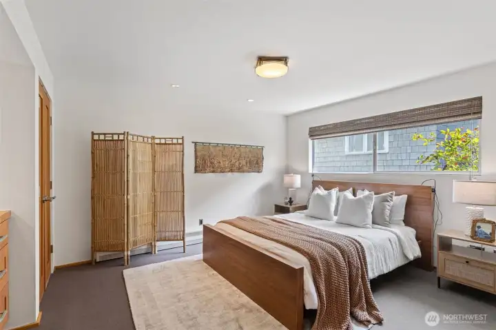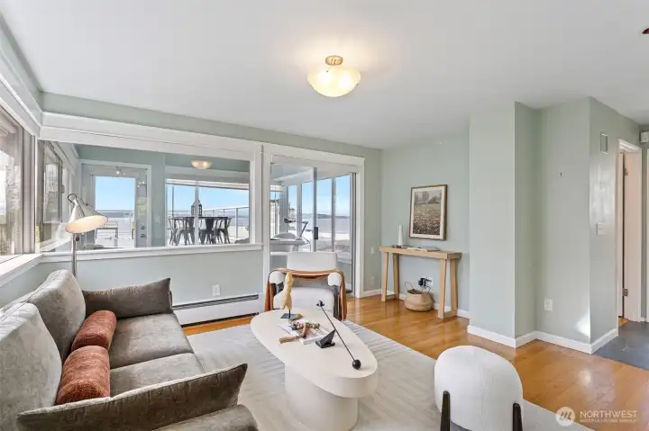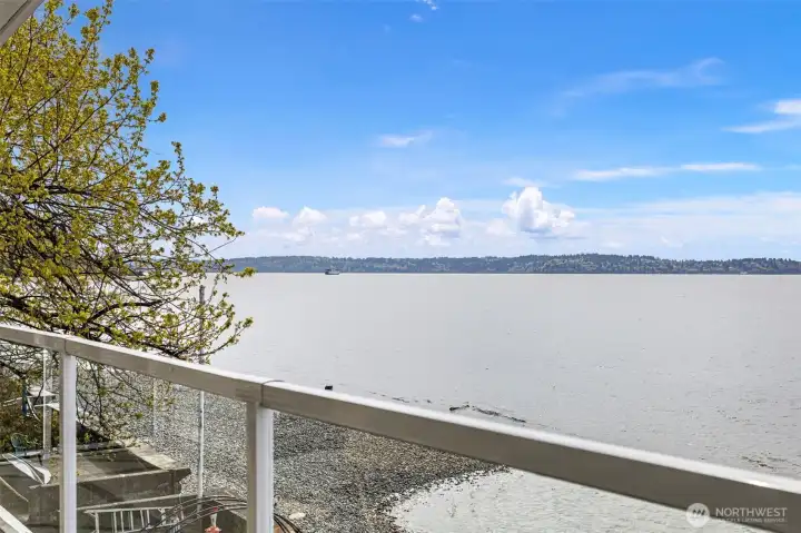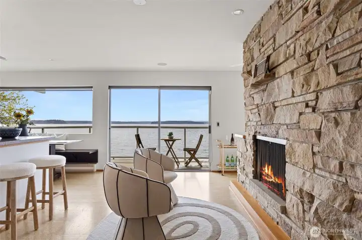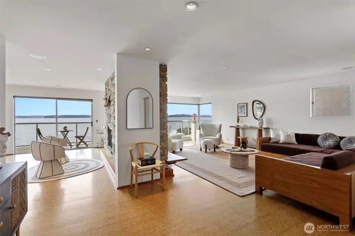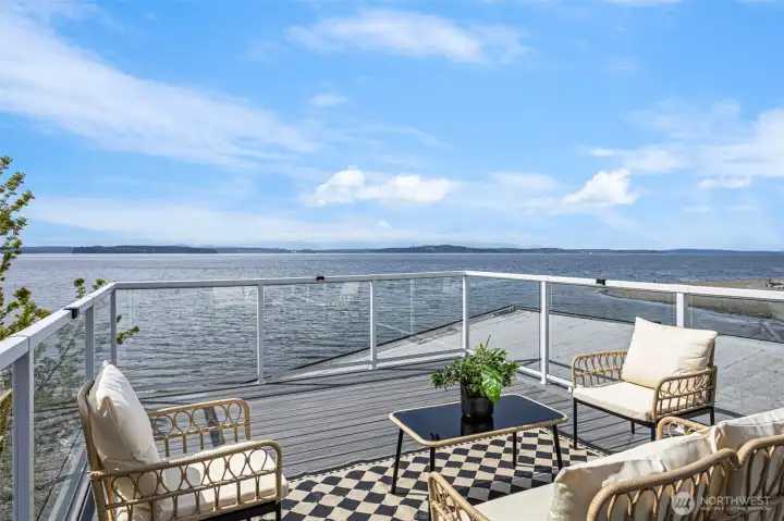 A truly rare opportunity at the entrance to Lincoln Park—own two-thirds of an exclusive waterfront condo complex where homes seldom come to market. This unique offering includes a spacious main-level residence and a private penthouse, ideal for multi-generational living, investment, or an elevated owner-occupant lifestyle. The main-level home offers easy access from two assigned parking spaces and a smart single-level layout. A wall of windows showcase sweeping views of Puget Sound and the Olympic Mountains, filling the open living and dining areas with natural light. A generous living room centers around a mid-century fireplace, creating a warm and inviting gathering space. The remodeled kitchen features high-end Viking appliances, a walk-in pantry, built-in dining nook, and access to a long view deck for seamless indoor-outdoor living. The primary suite includes three closets, custom built-ins, and a beautifully updated bath. An additional en-suite bedroom works perfectly for guests or a home office, plus two more bedrooms, a full bath, and utility room. Upstairs, the penthouse offers 1 bed, 1 bath, and a stunning rooftop deck—perfect for entertaining or soaking in peaceful water views. An exceptional, move-in-ready offering in an unbeatable waterfront setting.