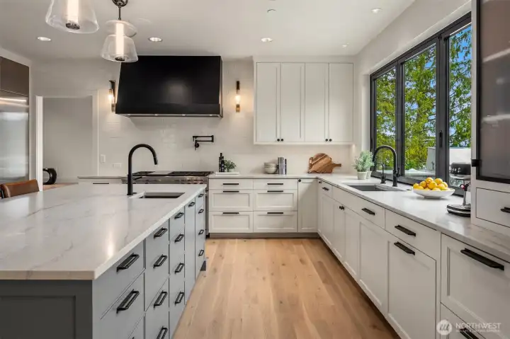 Wide, expansive views & 100 feet of waterfront at this newly completed, custom, street-to-water estate by Saad Custom Homes. Placed on a shy acre, this home offers the best of indoor/outdoor living with multiple entertaining areas & expansive flat lawn at the water’s edge. Private dock accommodates a 70+ ft yacht & additional watercraft. Inside, enjoy brand-new construction: the kitchen, dining & great room are the heart of the home providing thoughtful spaces for everyday living & festive gatherings. Guest suite & office on the main level + six additional bedrooms including view primary with spa-like bath. Ideal floor plan with rec room/bar, gym & sauna. Nothing is missing at this modern luxury estate in one of the most sought-after communities in the Northwest.