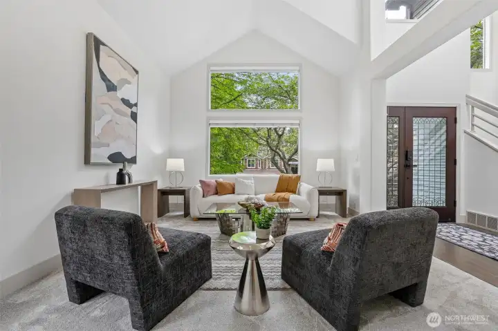 Light filled living room with vaulted ceilings