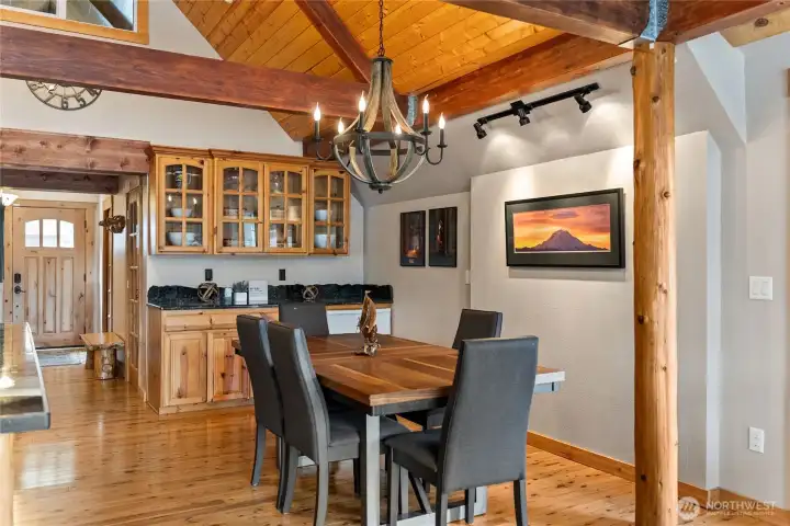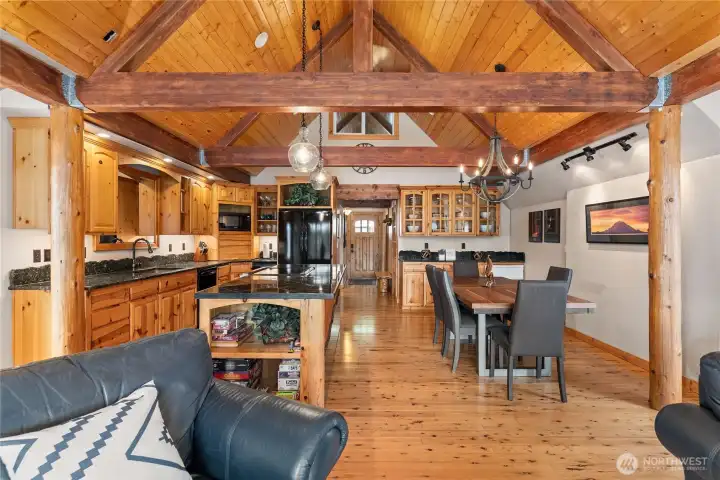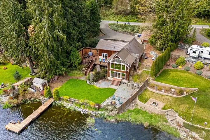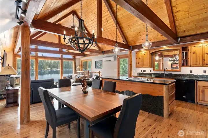 Nestled along the serene shores of Lake Whitman, this stunning 2,435 sq ft home offers 3 bedrooms, 1.75 baths, and a rare combination of warmth, character, and unforgettable views. With 58+ feet of true no-bank waterfront and private lake access, your backyard becomes your everyday escape—complete with a private dock for swimming, paddle-boarding, fishing and your favorite boating. Inside, the home welcomes you with a striking lodge-inspired design—soaring vaulted ceilings, dramatic exposed wood beams, and rich natural wood finishes create an inviting atmosphere. Floor-to-ceiling windows capture breathtaking panoramic lake views from nearly every angle, flooding the space with natural light and seamlessly blending indoor and outdoor living. A charming pellet stove adds ambiance for that log cabin experience. The kitchen is designed for gathering, featuring a spacious island, generous cabinetry, and an easy flow into the dining and living areas—ideal for entertaining or relaxed everyday living. Step outside onto the expansive wraparound deck, where morning coffee, sunset dinners, and weekend BBQs all come with a breathtaking backdrop. Down by the water, a beautifully landscaped yard and private fire pit sets the stage for unforgettable evenings under the stars. Whether you're seeking a full-time home, getaway, or investment, this property delivers—featuring a proven short-term rental history and turnkey Airbnb potential with both rustic charm and modern amenities.