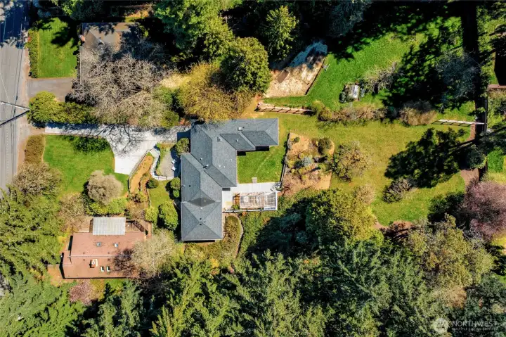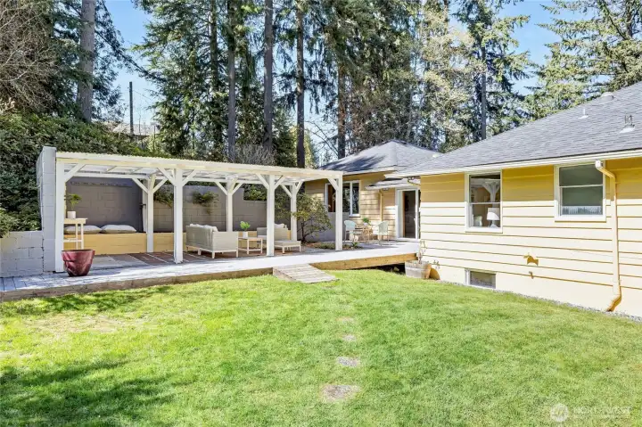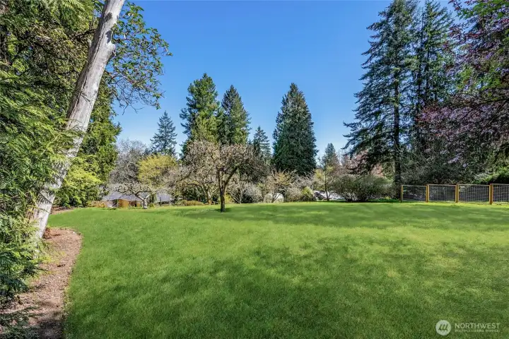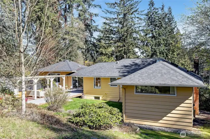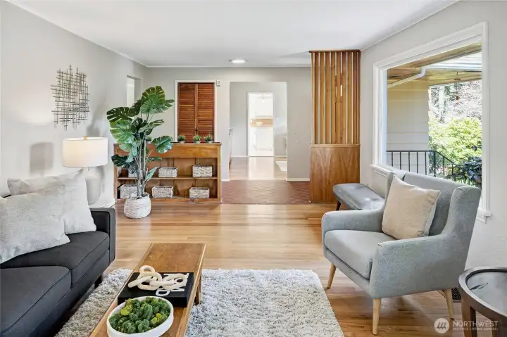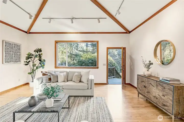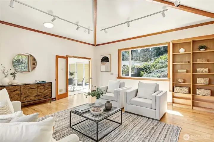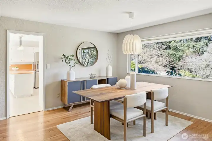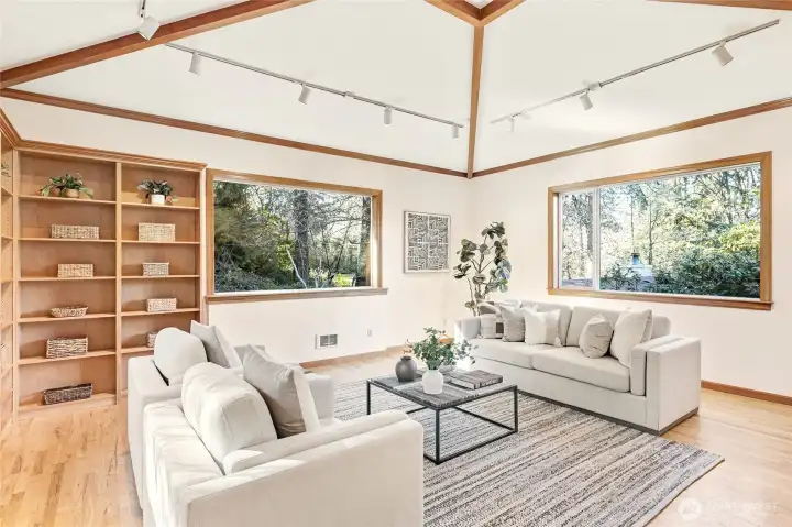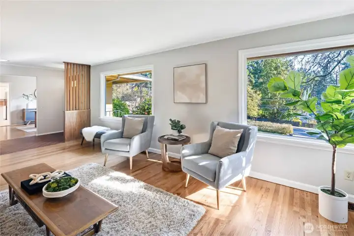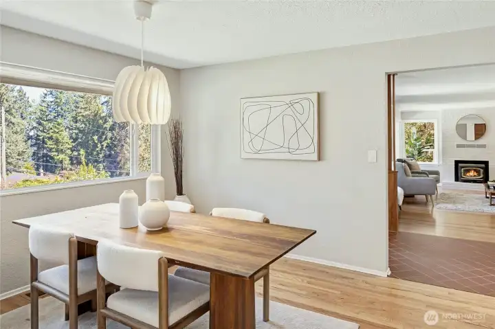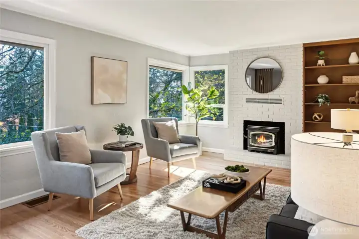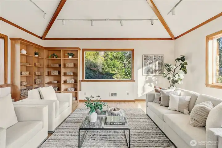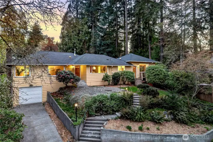 A hidden retreat in the heart of North City, this beautiful home brings together nature, light & thoughtful design in a setting that feels both grounded & restorative. Classic formal spaces feature oak hardwoods, wood stove, & period built-ins that reflect its timeless character, while the expansive studio-style great room serves as the heart of the home with vaulted ceilings, walls of windows, & serene garden views that keep the outdoors ever present. The light-filled kitchen opens seamlessly to expansive deck & covered patio, creating an easy flow between indoor and outdoor living that supports both everyday life & effortless entertaining. The private primary suite overlooks a peaceful courtyard & lush gardens, offering a quiet sense of retreat, complemented by three additional bedrooms, a lower-level rec room, & dedicated office that provides flexibility for work & guests. The grounds feel park-like yet intentionally maintained, with orchard, greenbelt backdrop, & layered landscaping that create privacy & a sense of calm throughout the seasons. Newer roof, sewer line, interior paint, waterproofing & more! Pre-inspected. A great commuter location with nearby light rail providing easy access to downtown, Lynnwood, Federal Way, & Redmond. Deeded access to Lake Forest Park Civic Club for private beach, clubhouse & boat launch! A rare combination of setting, space & nature, this home lives in quiet balance with its surroundings while staying closely connected to the city.