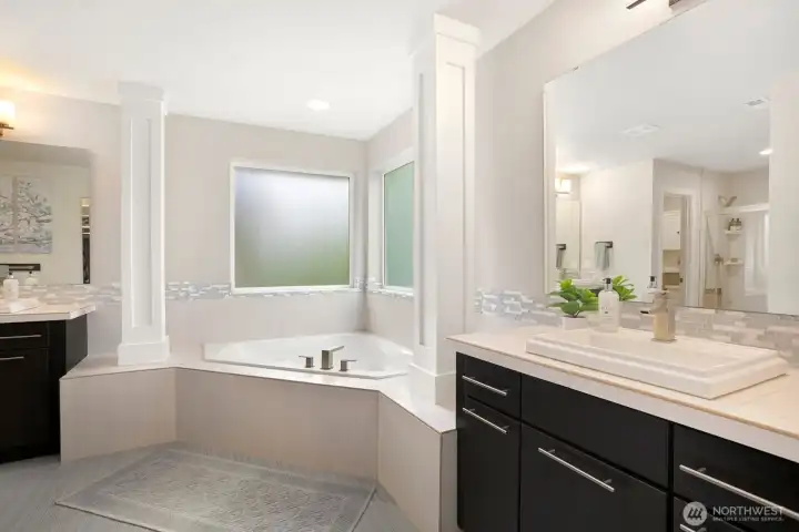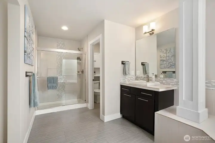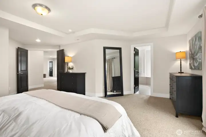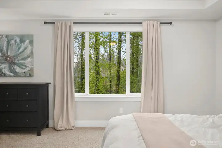Primary bedroom on upper level overlooking tranquil greenbelt!