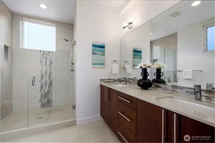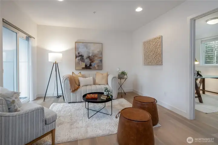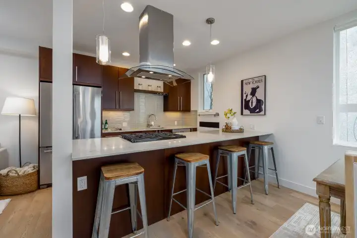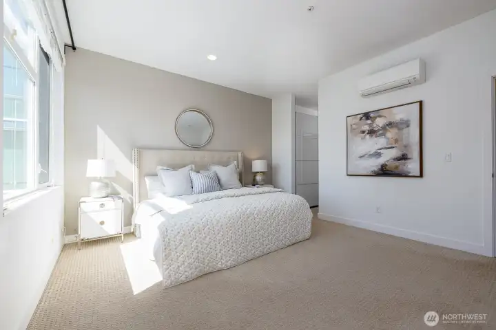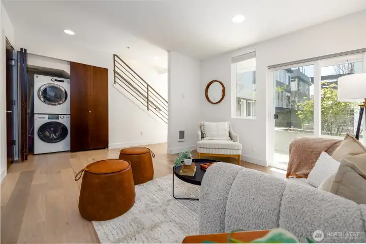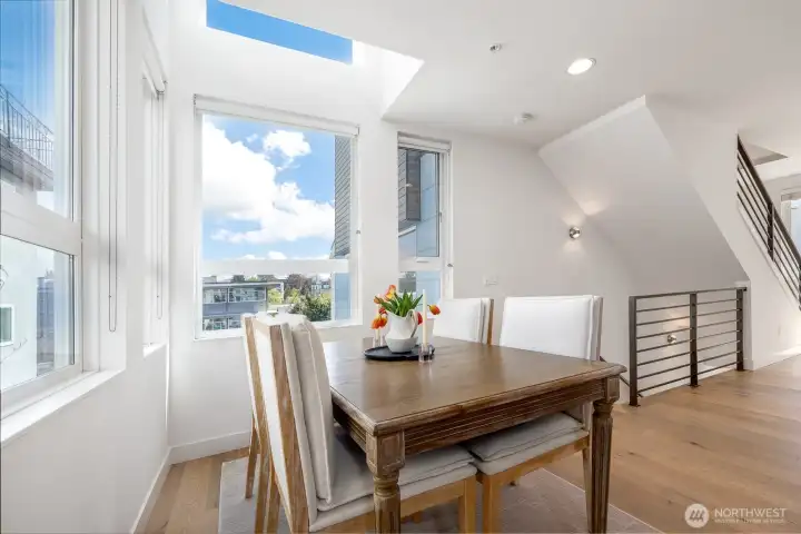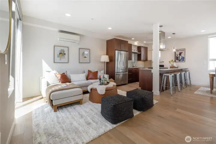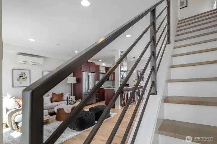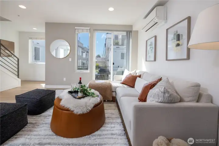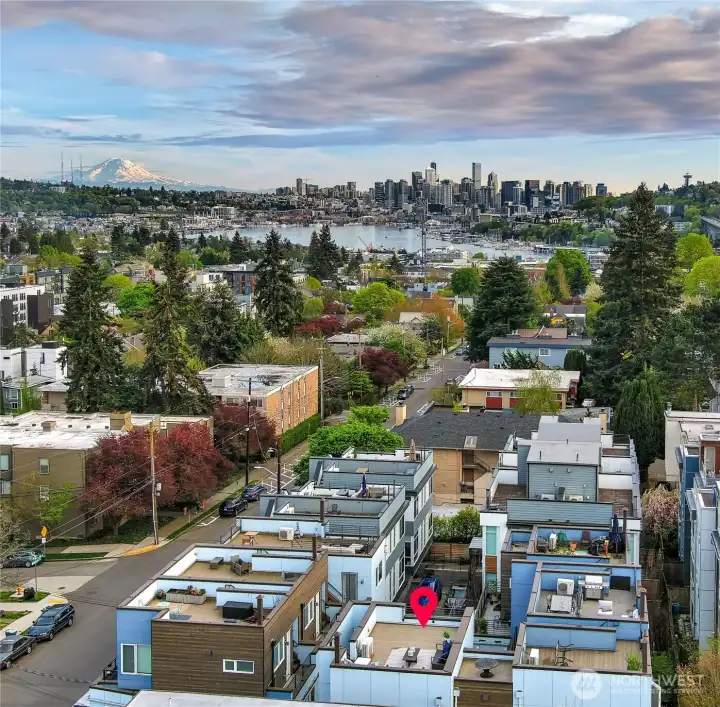 Gorgeous move-in ready townhome with views to the city. PRIME LOCATION for this 2 bedroom, 2 bath townhome with air conditioning! Sunlit floorplan with multiple outdoor spaces including the large rooftop deck. Lower floor includes a bonus room and patio + bedroom + large full bath + laundry. Main floor is wide open and flooded with natural light complete with a stunning kitchen, spacious dining with two-story windows, and living area with deck. Primary suite takes up the top floor with views to the twinkling Seattle skyline and features a large bath, and closets with custom built-ins. Tankless water heater! Just in time for summer and the 4th of July, enjoy views to Lake Union, downtown Seattle and Mount Rainer. Assigned parking spot in common garage. Walkable! Less than a mile to all the fun and amenities at Green Lake and Woodland Park Zoo. Or head on down to Gas Works Park and everything Lake Union. Just 2 miles to the UW and less than 3 miles to downtown for an easy commute.