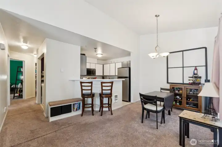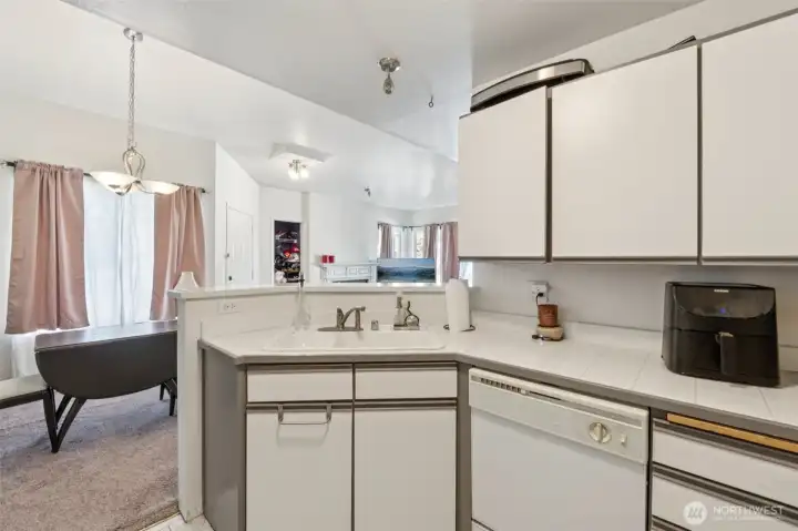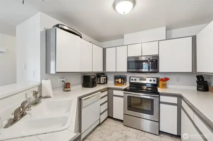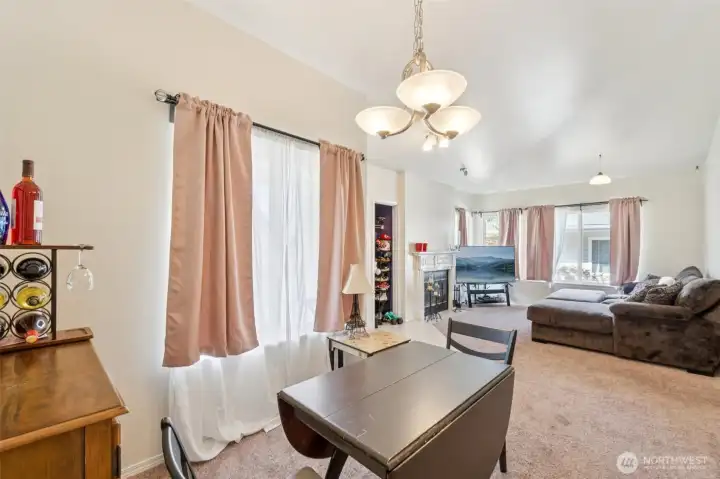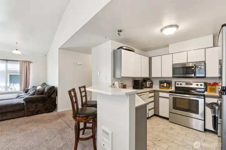 Enjoy easy living in this light and bright top-floor corner condo in highly desirable Lake Stevens. With no upstairs neighbors and a single-level layout, this home is filled with natural light thanks to vaulted ceilings and large windows throughout. The open-concept living area features a cozy wood-burning fireplace and an inviting layout perfect for everyday living or entertaining. The kitchen offers a breakfast bar and abundant cabinetry, plus all appliances stay, including the washer and dryer.The spacious primary suite includes double sinks, a walk-in closet, and a walk-in shower. Both bathrooms have been refreshed with new vanities, LVP flooring and are freshly painted. Additional conveniences include a private front patio with space for seating to enjoy the outdoors, a storage closet and your own covered parking space located just outside the steps to your front door. Ideally located for great walkability near shopping, restaurants, and everyday conveniences, with easy access to public transportation, Davies Beach, and sought-after Lake Stevens Schools. Community amenities include a clubhouse, exercise room with equipment, hot tub, and ample visitor parking. Comfortable, convenient living in a terrific community!