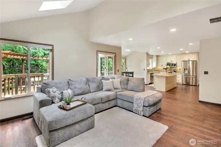 Vaulted ceilings and skylights over huge family room