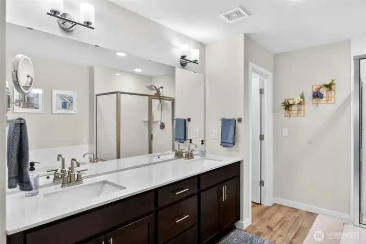 Dual vanities, built-in makeup station, soaking tub and separate shower