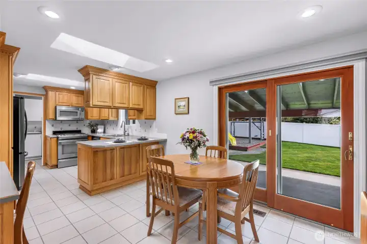 Enter the kitchen you have clean crisp finishes, plenty of room for dining with additional eating space and direct access to your incredible out door patio and backyard through your custom Anderson slider