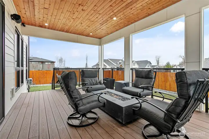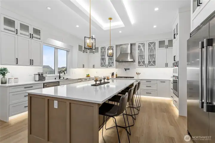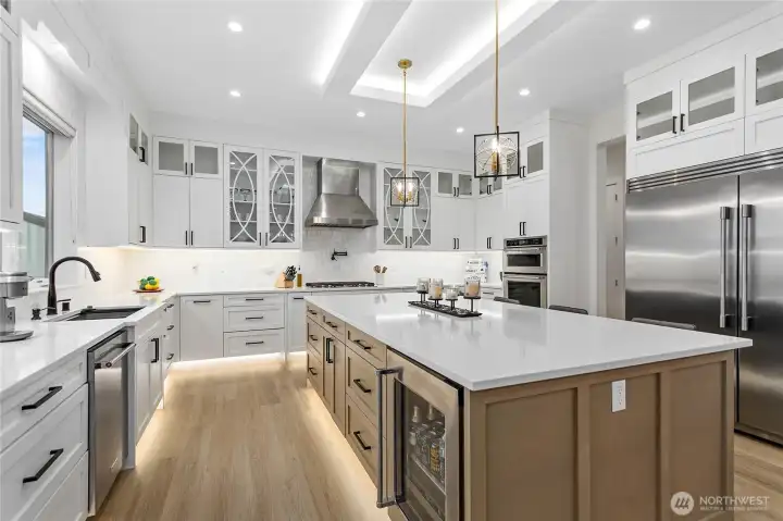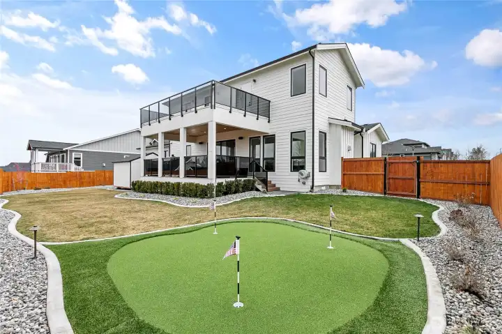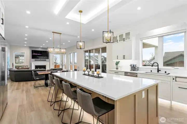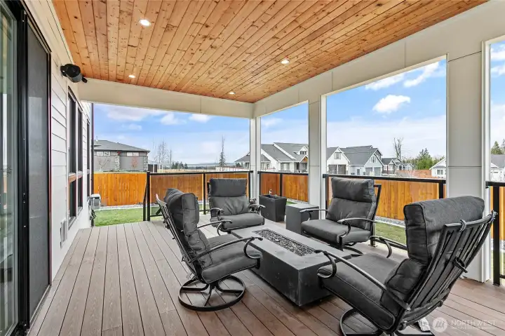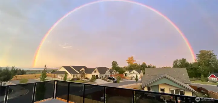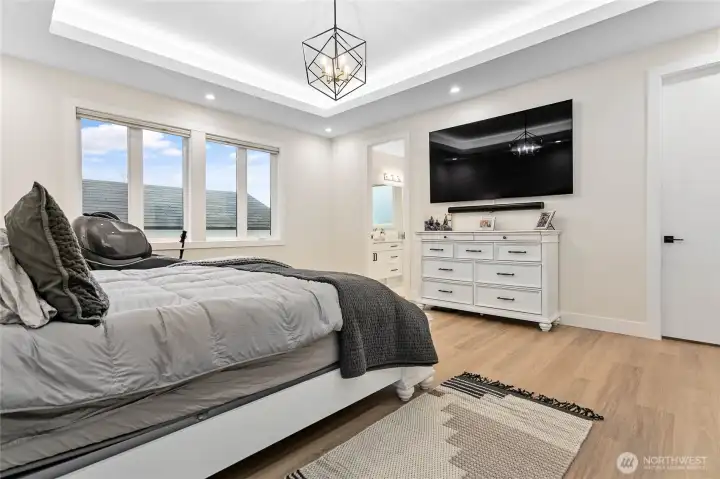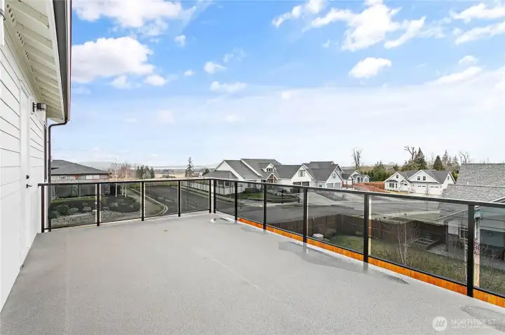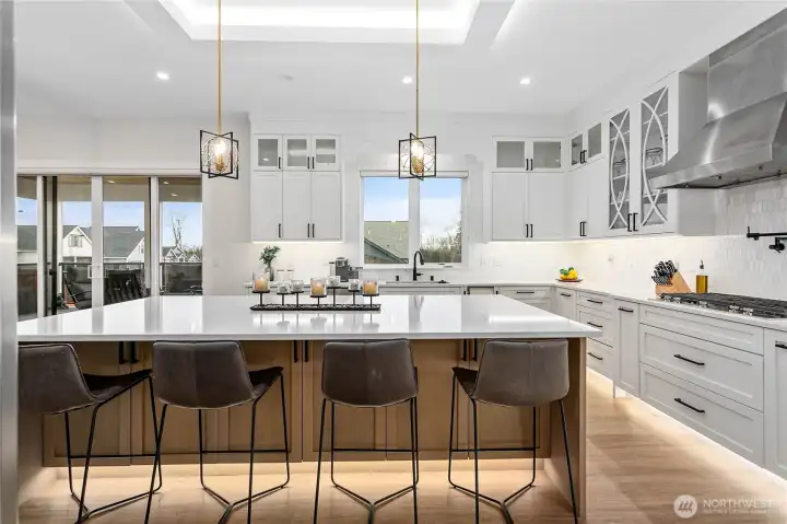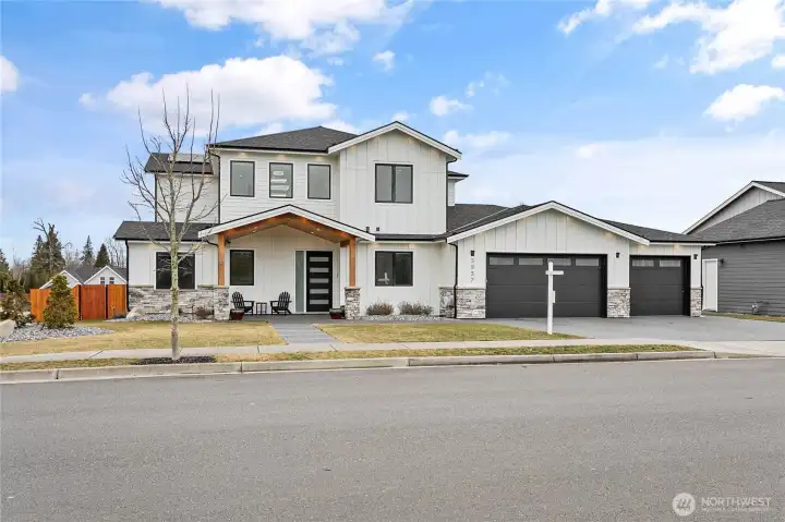 Elevated living in one of Ferndale’s most desirable neighborhoods, this like-new luxury home in The Meadows offers Bellingham Bay views, refined finishes, and a rare dual primary suite design ideal for multi-generational living or hosting guests in style. Spanning 3,515 sq ft, this 4-bedroom, 3.5-bath home with a dedicated office blends thoughtful design with everyday functionality. The open-concept main level features soaring 10’ ceilings, expansive windows, and a statement fireplace, flowing seamlessly into a chef’s kitchen with a massive quartz island, double refrigerator, high-end appliances, and extensive cabinetry storage. LVP flooring runs throughout, creating a cohesive and low-maintenance living space. A true standout, TWO spacious primary suites each offer larger walk-in closets and spa-inspired en-suites with tile showers and soaking tubs. One suite opens to a private deck with sweeping bay views, while both upper and lower decks are equipped with natural gas stubs and power, perfect for outdoor entertaining year-round. Additional highlights include A/C, a security system, fully fenced, beautifully landscaped grounds with a putting green, a huge storage shed, and a 3-car garage with epoxy floors, lots of storage, and EV charging. Lots of community walking trails are just steps from your door. Located just minutes to I-5, Ferndale schools, and Bellingham, this home delivers a rare combination of luxury, flexibility, and location in the Whatcom County market.