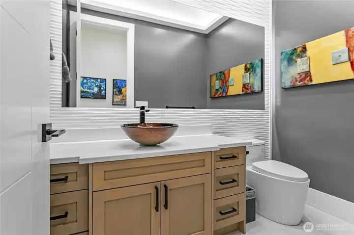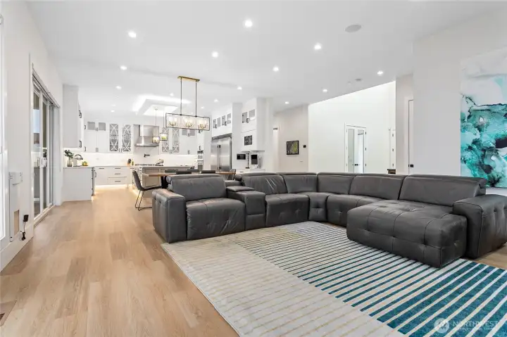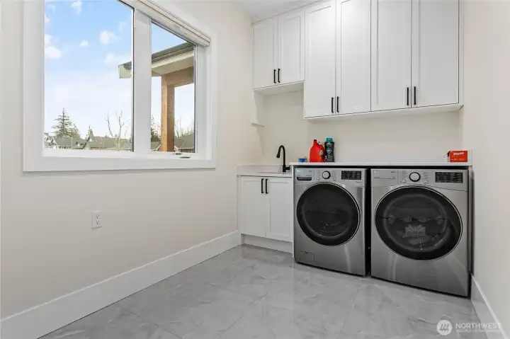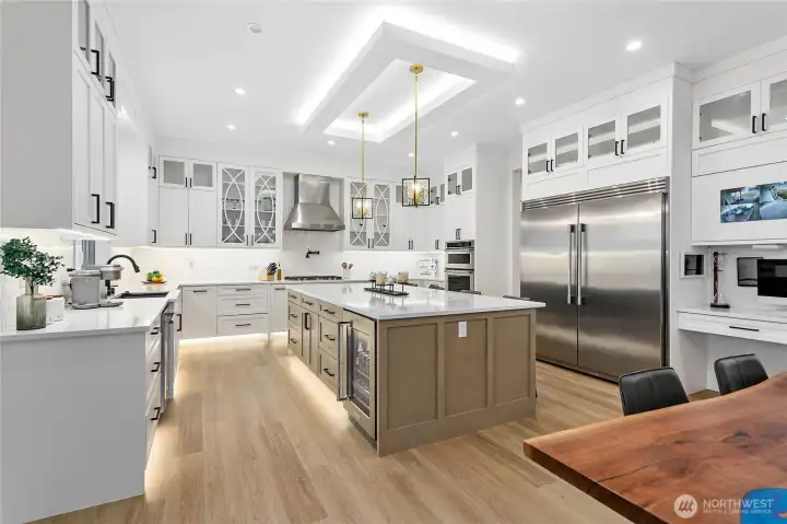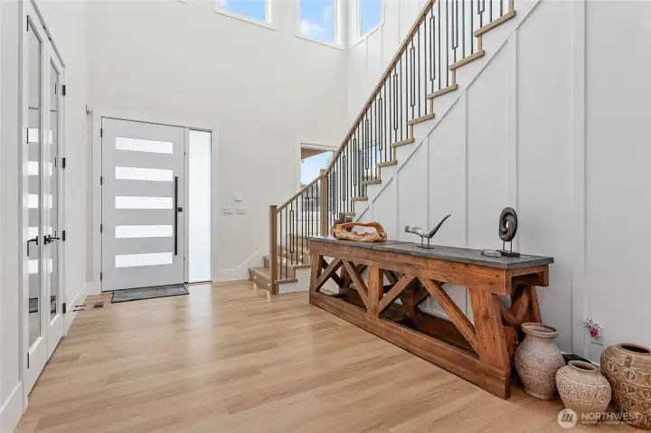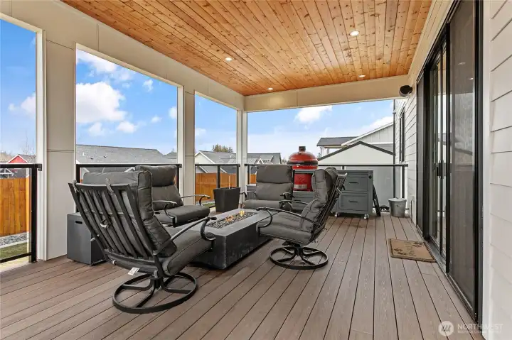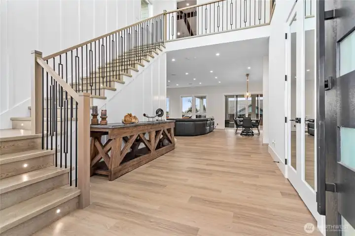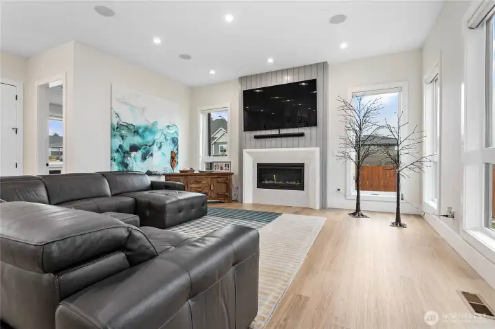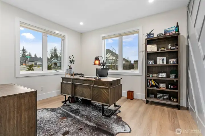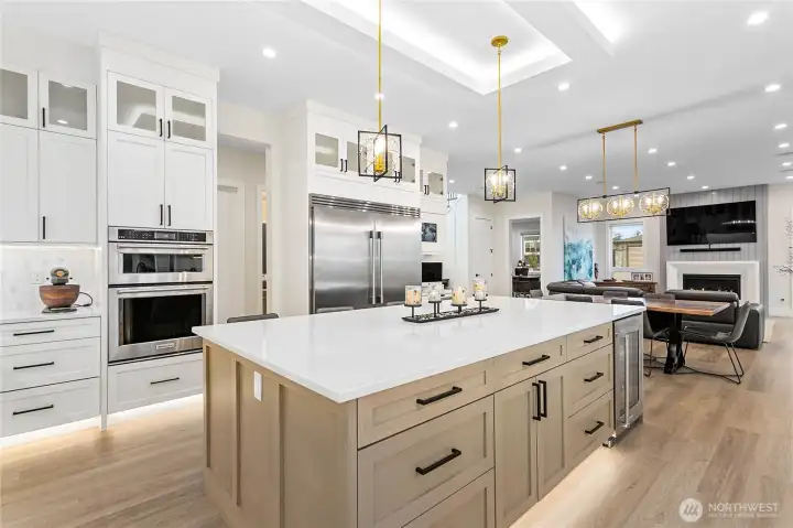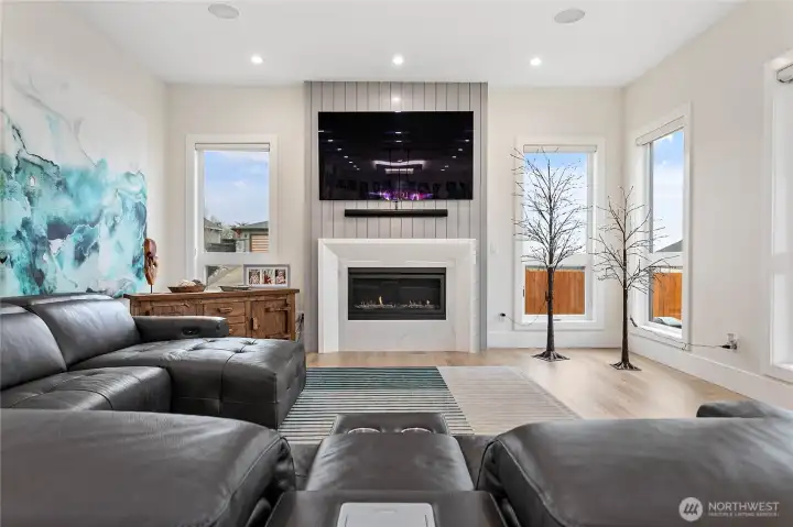 Elevated living in one of Ferndale’s most desirable neighborhoods, this like-new luxury home in The Meadows offers Bellingham Bay views, refined finishes, and a rare dual primary suite design ideal for multi-generational living or hosting guests in style. Spanning 3,515 sq ft, this 4-bedroom, 3.5-bath home with a dedicated office blends thoughtful design with everyday functionality. The open-concept main level features soaring 10’ ceilings, expansive windows, and a statement fireplace, flowing seamlessly into a chef’s kitchen with a massive quartz island, double refrigerator, high-end appliances, and extensive cabinetry storage. LVP flooring runs throughout, creating a cohesive and low-maintenance living space. A true standout, TWO spacious primary suites each offer larger walk-in closets and spa-inspired en-suites with tile showers and soaking tubs. One suite opens to a private deck with sweeping bay views, while both upper and lower decks are equipped with natural gas stubs and power, perfect for outdoor entertaining year-round. Additional highlights include A/C, a security system, fully fenced, beautifully landscaped grounds with a putting green, a huge storage shed, and a 3-car garage with epoxy floors, lots of storage, and EV charging. Lots of community walking trails are just steps from your door. Located just minutes to I-5, Ferndale schools, and Bellingham, this home delivers a rare combination of luxury, flexibility, and location in the Whatcom County market.
