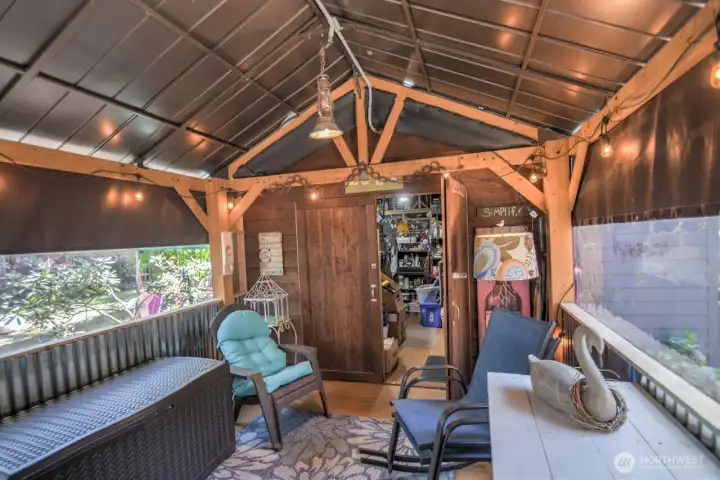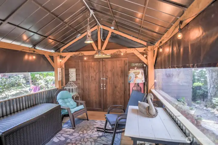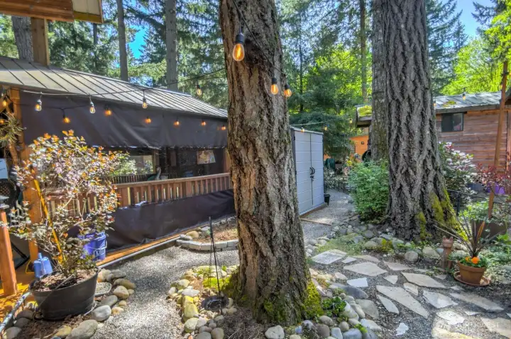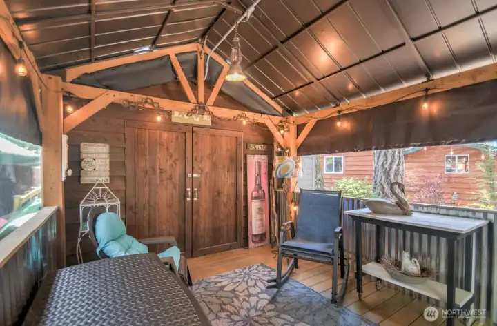 Beautifully landscaped RV site at 20 Hemlock offering comfort, functionality, and a welcoming outdoor setting. This well-maintained property features two storage sheds, including one converted into a versatile office space with washer and dryer, tankless water heater, large window with plantation blinds, LVT flooring, ship-lap siding, exposed rafters, fully insulated, French doors, thermostatically controlled wall heat, ceiling fan / light fixture with remote, power combo vent/fan and light, ethernet wiring / data port, bookshelves, built-in butcher block desk, a matching laundry folding table and a deep SS utility sink & cabinet with spray faucet option—perfect for added convenience. Enjoy the expansive pole barn cover that extends over the deck, and additional semi-enclosed seating area for all season use, complete with outdoor lighting to create an inviting space for entertaining, barbecues, or relaxing evenings. The grounds are thoughtfully designed with walking paths and attractive landscaping, supported by drip irrigation, providing a peaceful and visually appealing environment. Three water hydrants are conveniently located to simplify irrigation, watering or cleaning as needed. A unique opportunity to own a turnkey RV site ideal for outdoor living and hosting. COA amenities they include indoor outdoor pools sauna workout facility Pickleball playgrounds mini golf and hiking trail trails. The clubhouse host, private, and community events with stunning views of the lake.