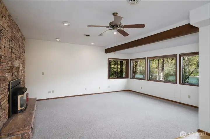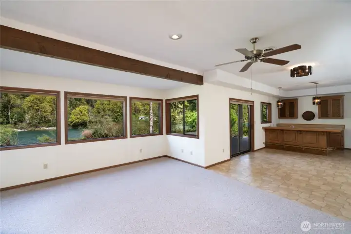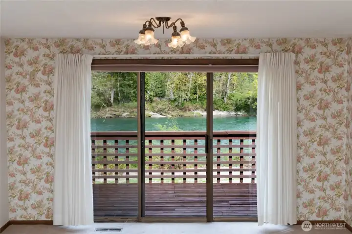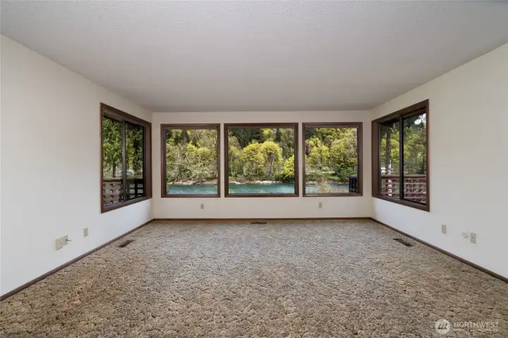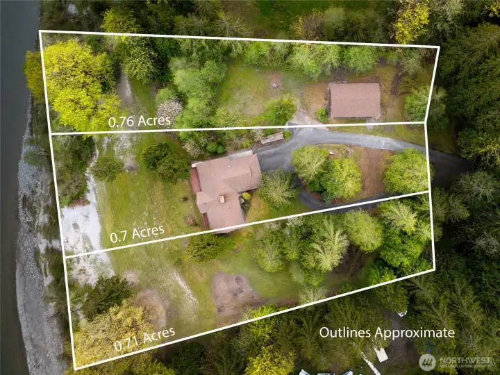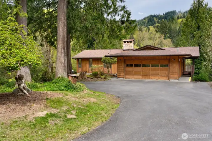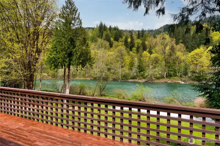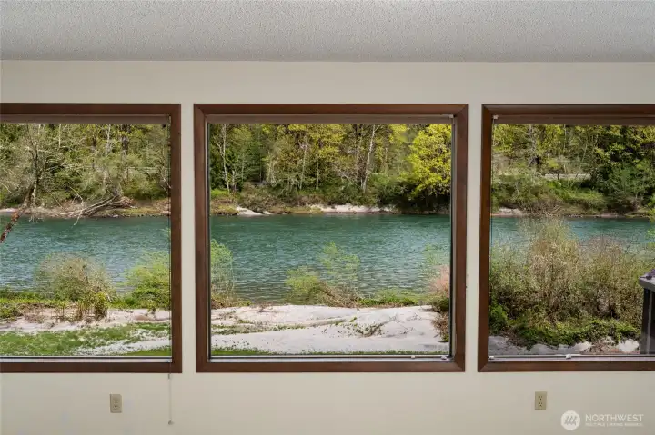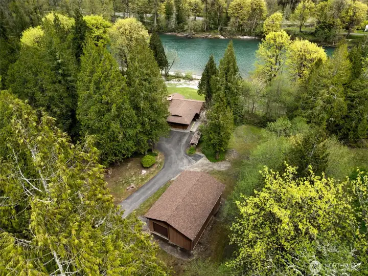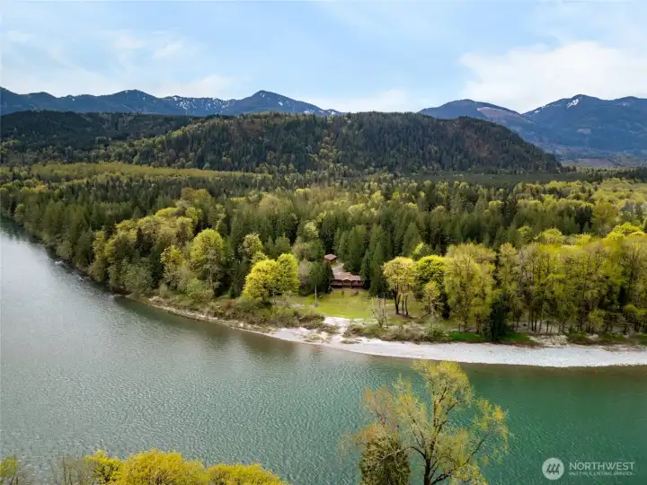 Exceptional custom high-bank Skagit River 3500 +/- sq ft home, on 2.17 acres in the peaceful Wilderness Village, first time on market! 3 parcels total, w/ potential to add 2 more homes. Incredible unmatched & unobstructed breathtaking panoramic waterfront views! The 3 waterfront parcels were high and dry & without damage during record breaking 100 yr. flooding in 2021 & 2025. This home boasts superior craftsmanship that has held up remarkably after all these years. Main level features a living room w/ a stunning brick gas fireplace, picturesque floor to ceiling windows, and access to a 770 sq ft +/- wrap around deck for entertaining. Enjoy incredible views of Mt. Sauk from your large well-designed kitchen while you cook! Spacious primary bedroom w/ dual vanity sinks, a walk-in closet, full bath & a private balcony. Centrally located staircase with a meticulously crafted wood paneling wall takes you down to the lower level. Lower-level w/ custom Scabos Travertine gas fireplace surround, additional kitchen, additional dining/recreational space & large family room all w/ uninterrupted views, opening up to a private patio w/ gentle slope to your 225 ft of low-bank waterfront! Potential mother-in-law suite! Downstairs also features 3 additional bedrooms & utility room w/ brand new 90%+ Energy Efficient Heat Pump & 400 AMP service. Attic w/ brand new insulation. 1080 +/- sq ft timber frame pull-thru shop features a brand new roof, power, & a separate single car garage. A must see!