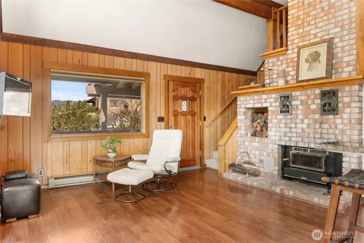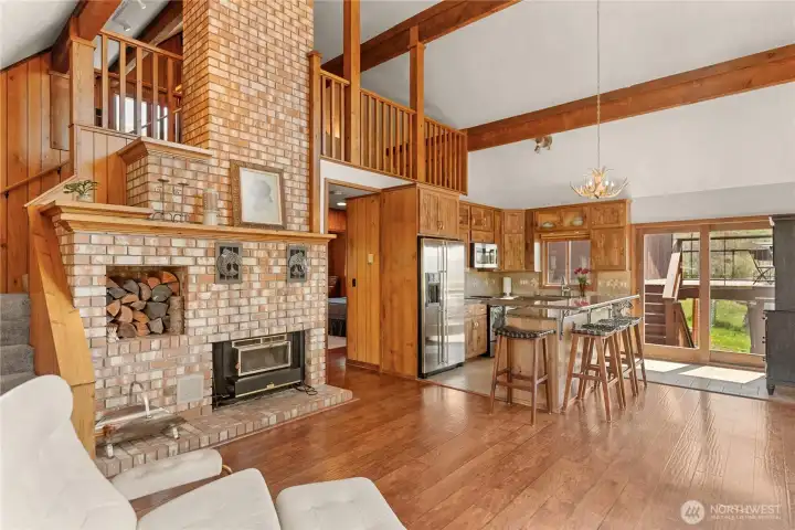Custom woodwork throughout with alder fireplace mantel, railings, and wrapped wood columns and moldings.