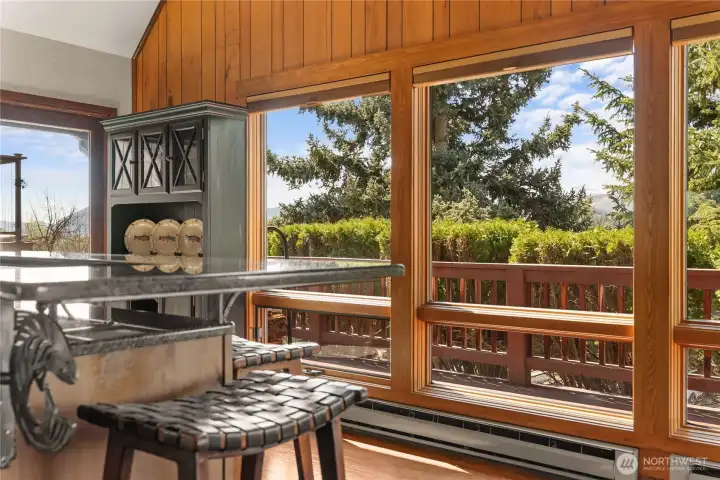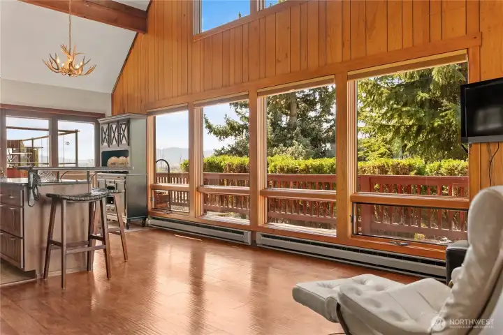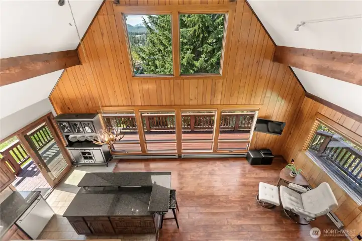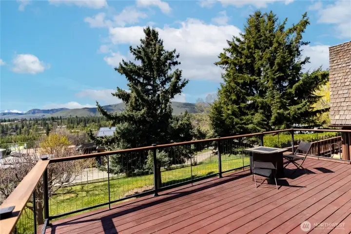 Views from your 12x24 cedar deck with stainless steel wire and railings. Hard wired lighting set up on a timer.