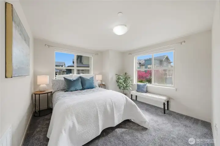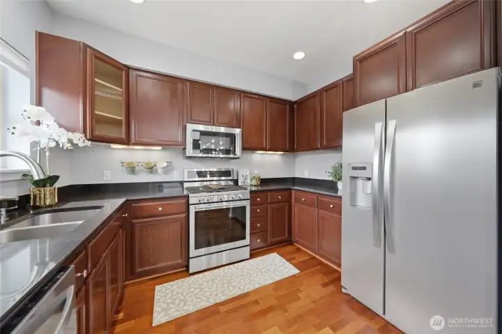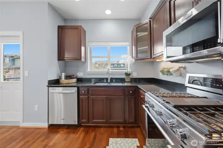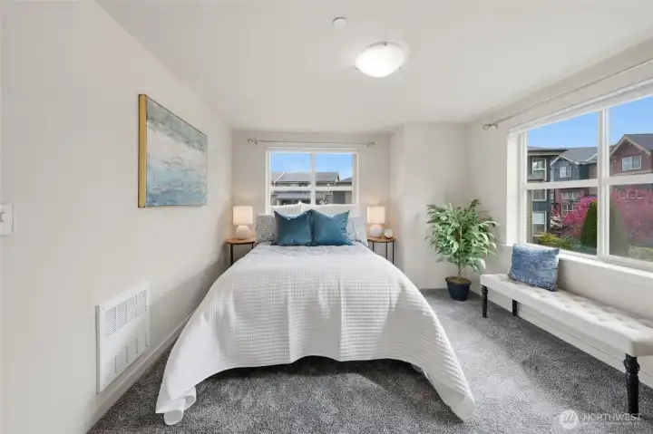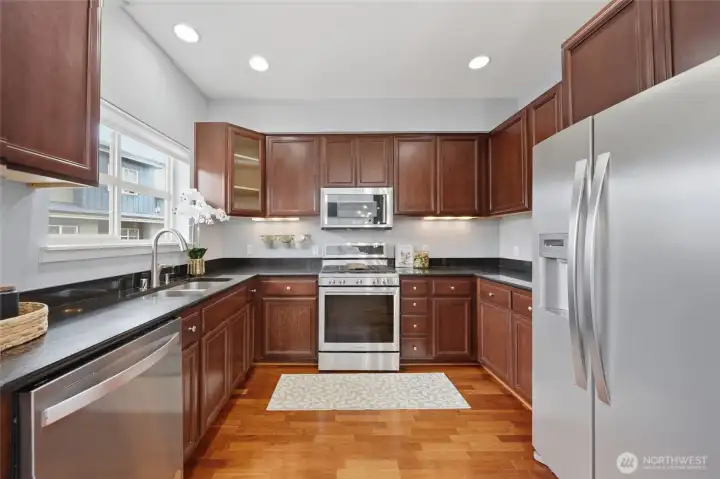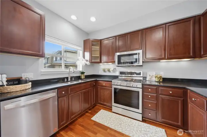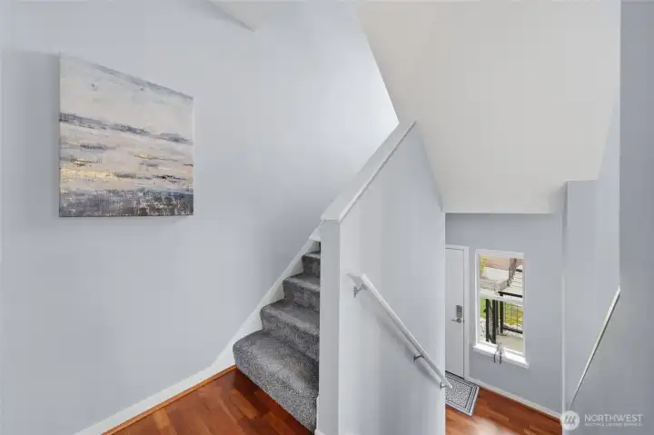 Welcome to Camden at Harbour Pointe! This desirable end-unit home features soaring ceilings and abundant natural light throughout. Recent updates include interior and exterior paint, new carpet, stainless steel appliances, quartz countertops, real wood cabinetry, and beautiful hardwood flooring. The spacious main-level primary suite offers an en-suite bath and walk-in closet, while a second primary suite provides flexibility for guests or multi-generational living. Floor-to-ceiling windows enhance the open feel, and a cozy gas fireplace adds warmth and charm. Enjoy energy-efficient hydronic heating to help manage utility costs. Relax on your private deck—perfect for BBQs—or unwind on the covered front porch with sunset views. Additional highlights include a lower-level storage room, side-by-side 2-car garage, plus two additional parking spaces and ample guest parking. Conveniently located just minutes from parks, shopping, dining, and commuter routes, with easy access to Mukilteo’s waterfront amenities and top-rated schools. A fantastic opportunity to own in a sought-after community!