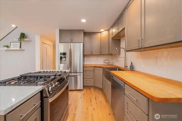 New gas stove with gridle allows you to see and talk to your guest while cooking. warm butcher block counter tops add to the warmth of the working kitchen.