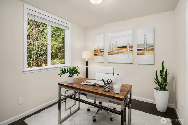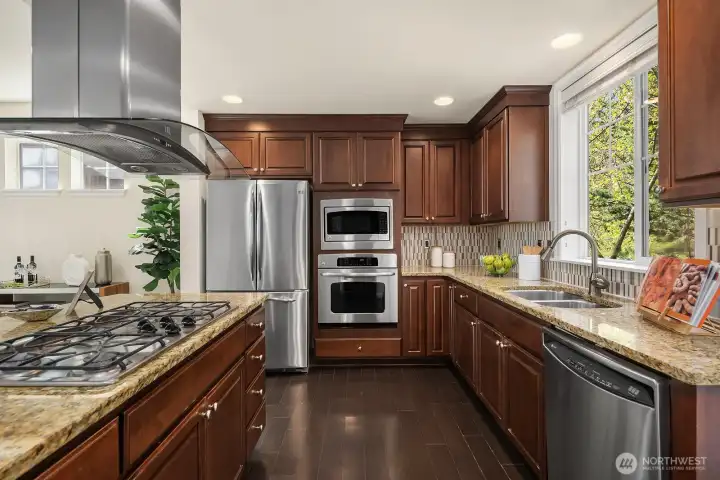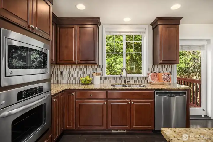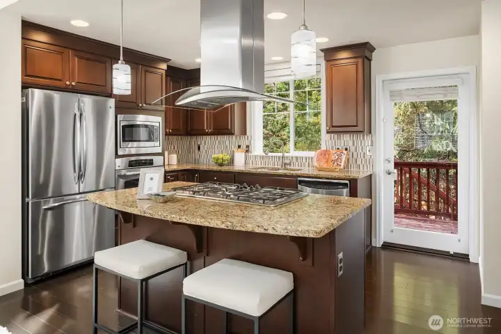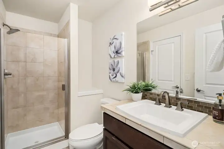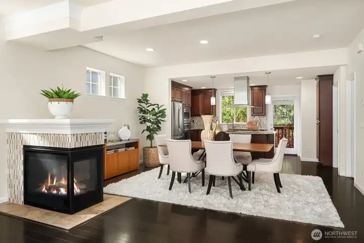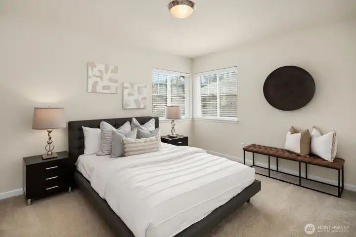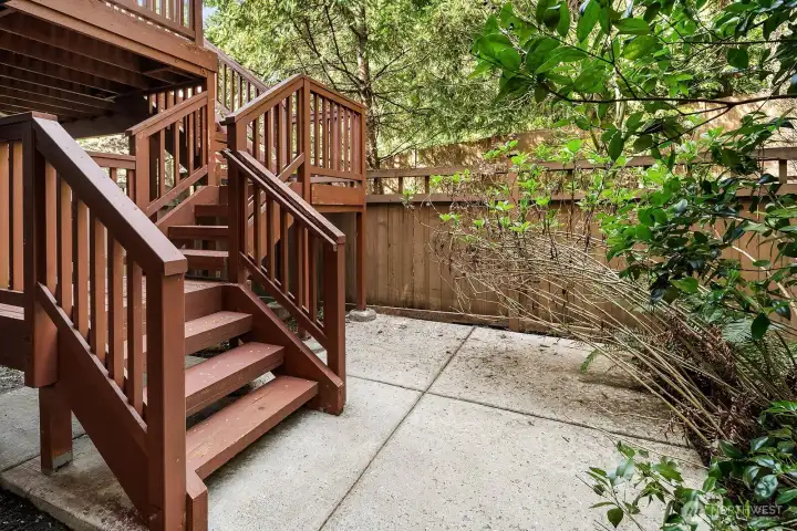 Exceptionally rare central Bellevue home with a premium layout in this area. South-facing home (3 bed / 3 bath) with a spacious main level featuring living and dining areas with large windows and strong natural light, flowing into kitchen with island, slab counters, full-height backsplash, and adjacent eating space. Kitchen includes direct access to outdoor patio/porch, supporting indoor-outdoor flow, ventilation while cooking, and easy access for grilling and entertaining. Living room windows face a neighborhood cul-de-sac, offering a quieter outlook away from main road traffic. Main level layout supports work-from-home, daily living, hosting, privacy, and comfort. Upper level includes two bedrooms, each with ensuite bathrooms, separated by a central utility/laundry area. Primary bath includes dual vanities, adding convenience for shared use. Layout provides separation and privacy between bedrooms, enhancing comfort. Main level bathroom also includes shower functionality, adding everyday convenience for guests and flexible use. Location offers quick access to downtown Bellevue, Bellevue Square, I-405, I-90, WA-520 and South Bellevue light rail station. Nearby outdoor access includes Burrows Landing Park and waterfront recreation at Chism Beach Park. Close to shopping, dining, parks, and award winning Bellevue schools. Recent improvement includes a brand-new roof (2025). Sewer capacity charge is fully paid off. Low HOA dues.