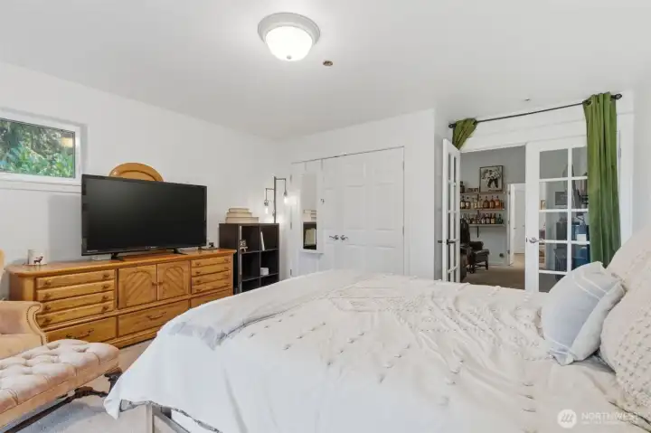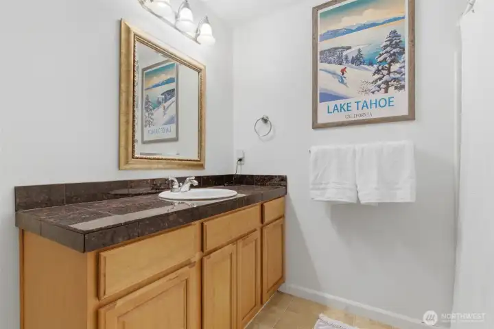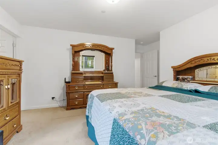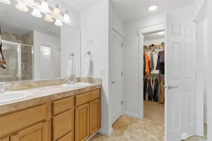 Ensuite primary bathroom with double vanity and walk-in shower.