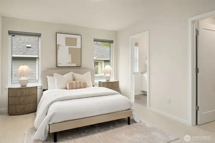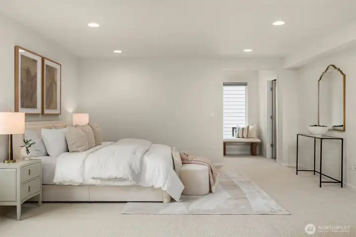 A custom Bali and Veneta window treatment package blends automation with versatility, featuring blackout, top-down/bottom-up, and remote-controlled blinds—offering refined control over light, privacy, and ambiance throughout the day.