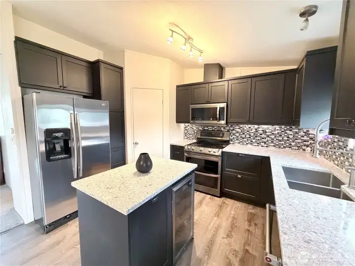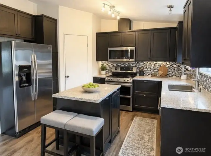 Quartz countertops and tile back splash, this kitchen was thoughtfully updated.