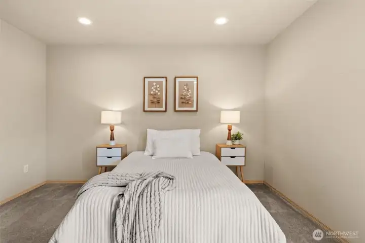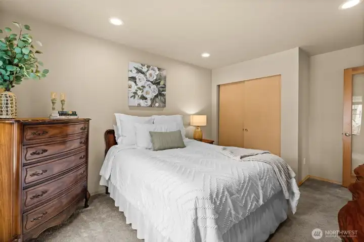 Comfort meets style in this spacious bedroom, featuring plush finishes and a layout that easily accommodates additional seating or a vanity