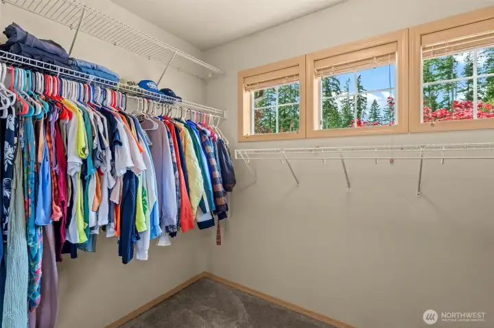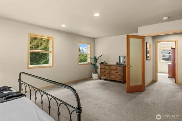 A true private retreat. This oversized primary suite offers a serene escape, characterized by soft natural light and plenty of room for a king-sized setup