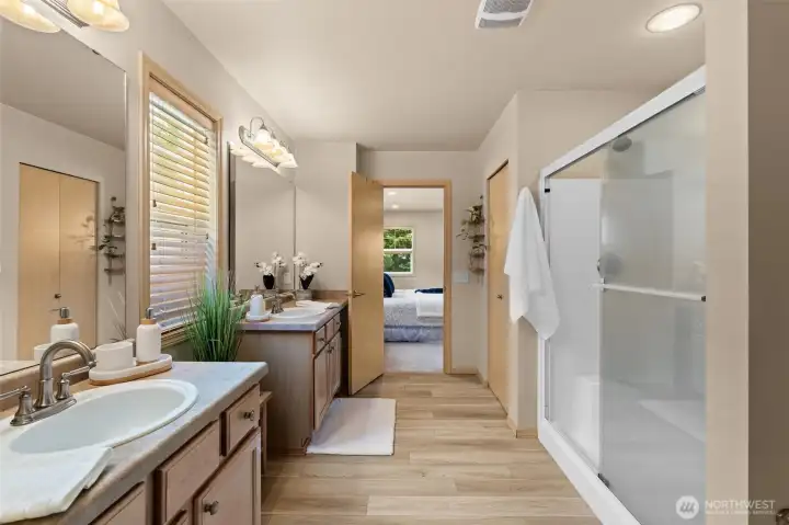 Bright and airy, this centrally located bathroom offers a fresh aesthetic with plenty of counter space and an easy-to-clean layout