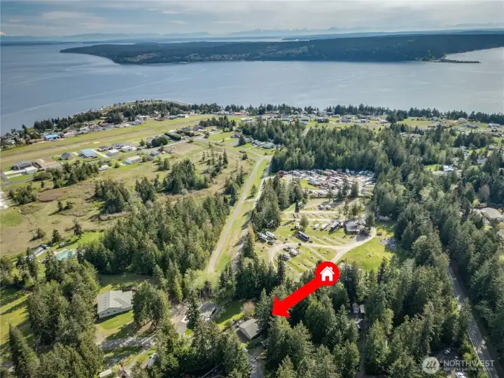 Aerial view with property location highlighted, showcasing proximity to water and community amenities
