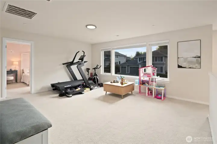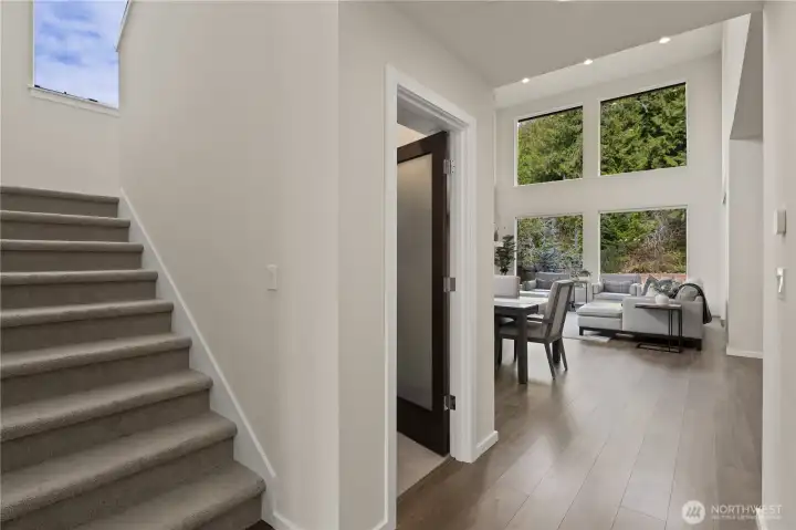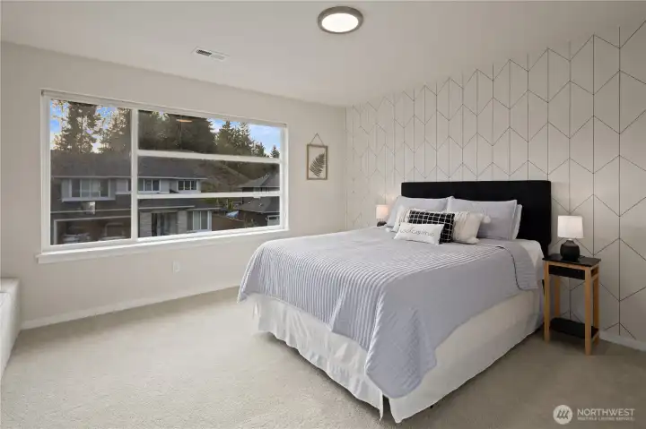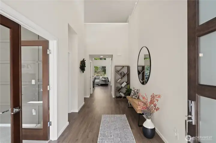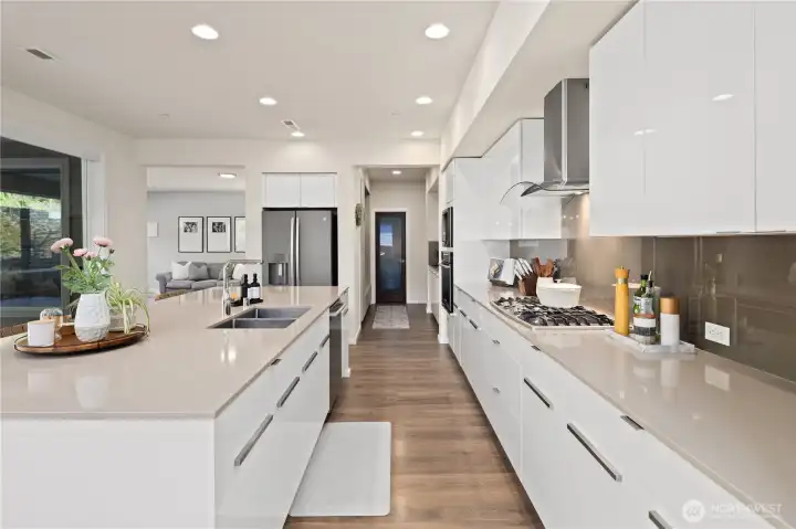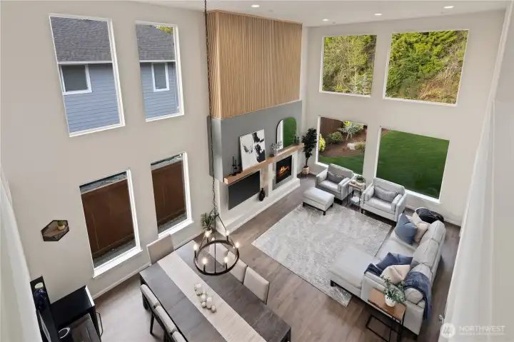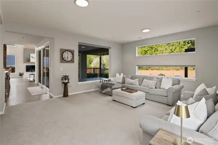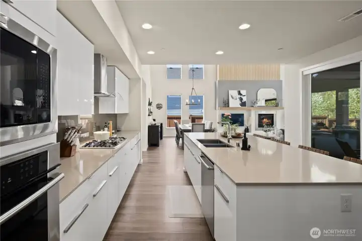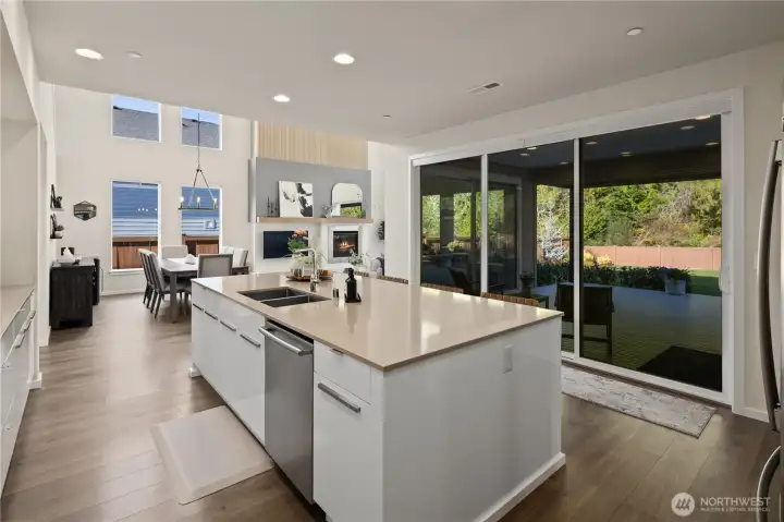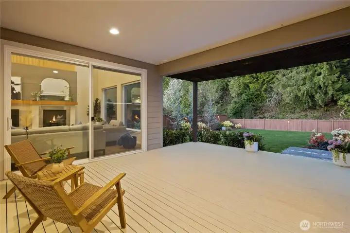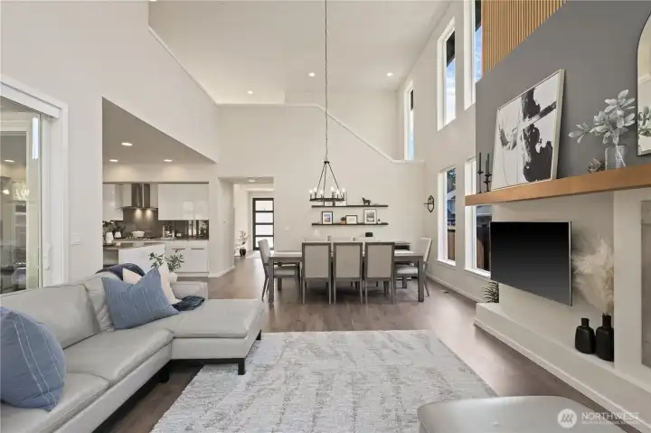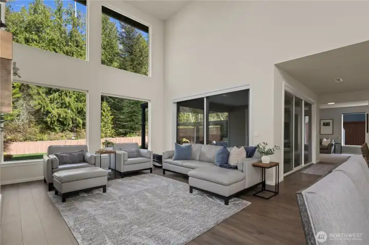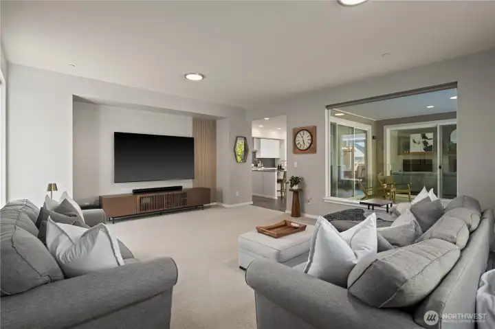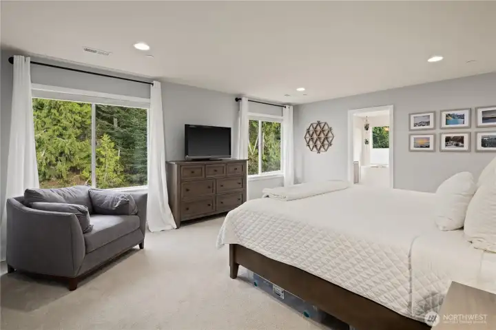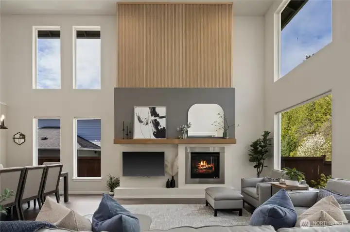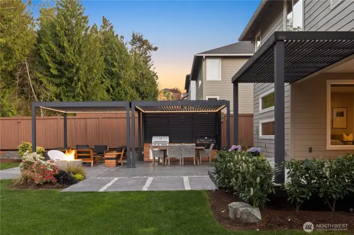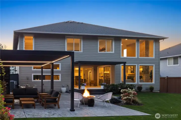 Located in the coveted Sky Island neighborhood, this MainVue Avoca offers a refined, retreat-like living experience with thoughtful design and elevated comfort. A grand two-story foyer opens to light-filled interiors, including a dramatic double-height Great Room with gas fireplace and expansive windows framing serene views of the private backyard and protected greenbelt. The chef-inspired kitchen with oversized island and walk-in pantry flows seamlessly into the dining area, ideal for everyday living and entertaining. The main level also features a versatile office or guest space with adjacent 3/4 bath. Upstairs, the primary suite is a true sanctuary with custom closet upgrades and a spa-inspired bath. Additional bedrooms each feature walk-in closets, while a spacious leisure room offers flexibility as a workout space, media room, or play area. Step outside to a customized backyard designed as a private escape. Entertain under the covered pergola with built-in outdoor kitchen, gather around the fire bowl, and enjoy curated landscaping with ambient uplighting. Backing to a lush greenbelt, this setting captures the beauty of the Pacific Northwest with a rare sense of tranquility. Additional enhancements include A/C, smart blinds, water softener, custom mudroom, underground sprinklers, smart quiet garage door openers, and wiring for a portable generator. A peaceful setting that feels worlds away, yet minutes to shopping, dining, and access to 410 for an easy commute.