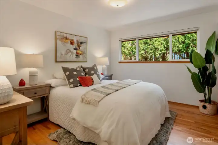 Primary bedroom / suite on the main level, which also has those gleaming red oak hardwoods.