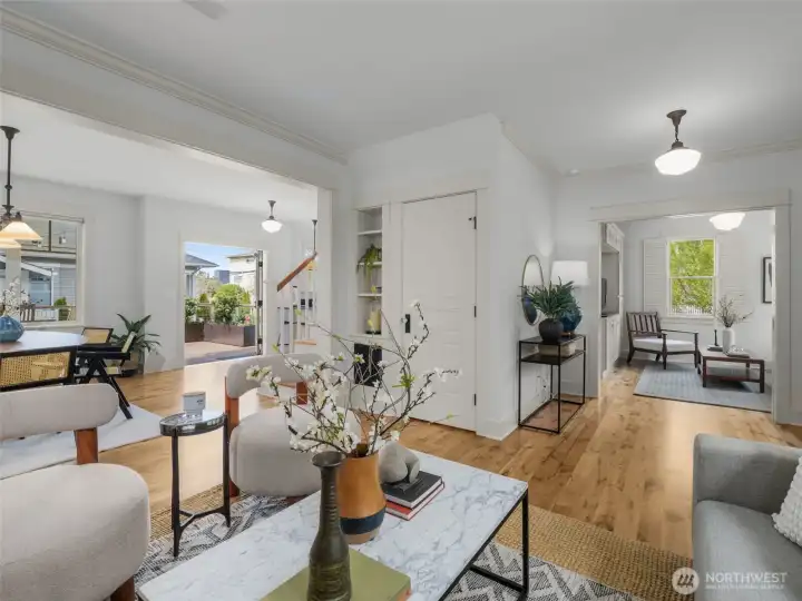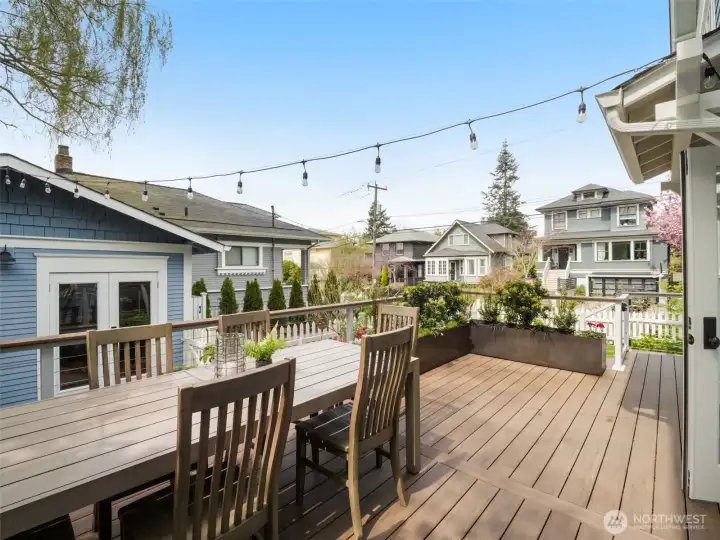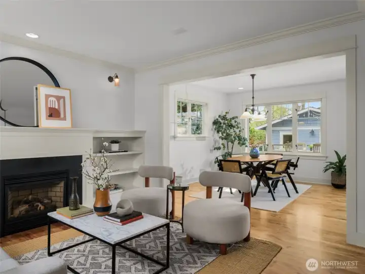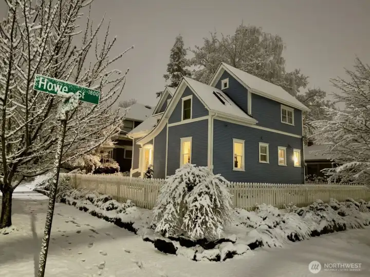 Perched on a coveted corner lot at the top of the hill, this impeccably remodeled residence offers timeless charm with modern perfection. A to-the-studs renovation by JAS has transformed the home into a light-filled showpiece, framed by the picture-perfect white picket fence and overlooking beloved Little Howe Park. Inside, the open-concept floor plan is designed for effortless living and entertaining, with sunlight pouring in the many windows. Beautiful hardwood floors, refined finishes, and thoughtful details create a warm yet sophisticated atmosphere. The stunning kitchen flows seamlessly into the dining and living spaces, with direct access to a generous West facing deck—ideal for morning coffee, summer dinners, or sunset gatherings. The home features three bedrooms upstairs with laundry and a loft, plus two beautifully appointed baths, basement storage, and a versatile den perfect for a home office, guest retreat, or media room. Every inch feels sparkling, polished, and move-in ready. Outside, exquisite new landscaping surrounds the property with blooming beauty and year-round curb appeal. Off-street parking with EV-charging, landscape lighting, and a shed add convenience to the home’s undeniable style. Rarely does a home combine such flawless condition, exceptional natural light, premier location, and storybook charm. All just two blocks to the heart of Queen Anne Ave’s bustling shopping, dining and Farmer’s Market. This is what perfection looks like!