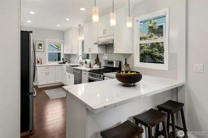 Set up and high above the street is this renovated, classic Craftsman bungalow.