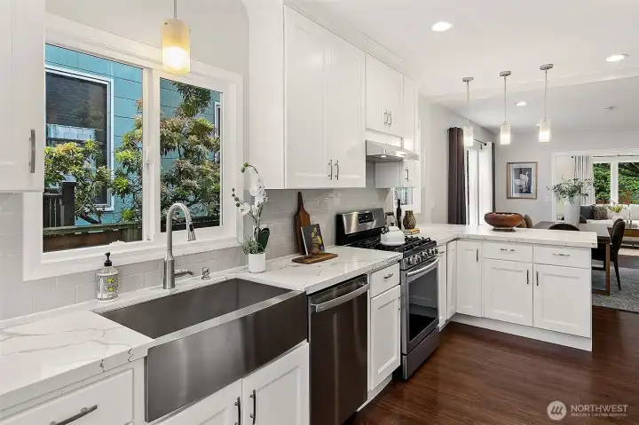 Kitchen with direct access to the back deck, garage and yard. So convenient!