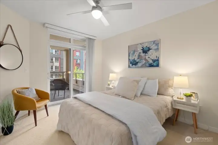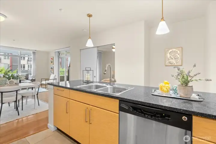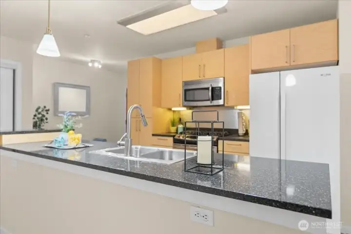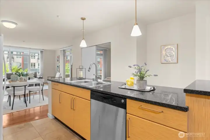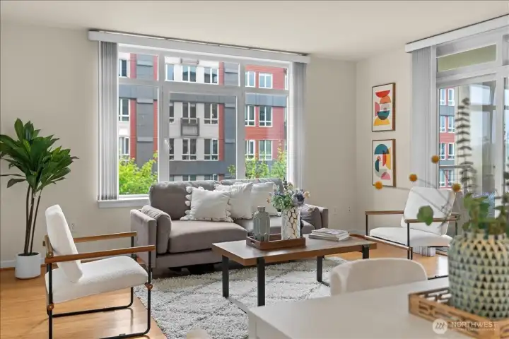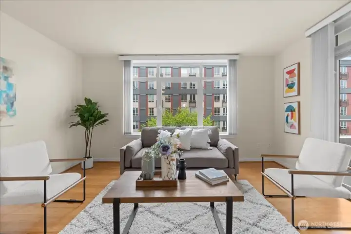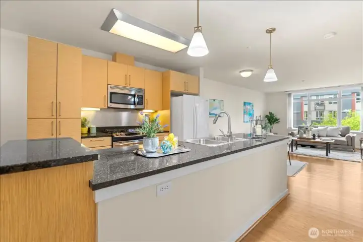 Experience elevated urban living in this light-filled 5th-floor residence at Hjärta—Ballard’s only LEED Silver certified condominium. Built with concrete and steel construction, this spacious 789 sq. ft. home offers exceptional durability, superior sound insulation, and energy efficiency rarely found in traditional wood-frame buildings. The southwest-facing layout fills the home with natural light and features an expansive living area, ideal open concept floor plan with bamboo flooring, cozy fireplace, in-unit washer/dryer, and sliding glass doors on to covered private deck for year round enjoyment. The thoughtfully designed kitchen includes granite countertops, stainless steel appliances, gas range, pantry, and tile finishes, while bathroom is accented with quartz surfaces and modern tile. Hjärta offers outstanding amenities, including a rooftop deck with P-Patch garden and BBQ, an owner’s lounge with pool table, and a fitness center—all designed to enhance everyday living. Built with green materials, low-VOC finishes, and a focus on healthier indoor air quality. Ideally located in the heart of vibrant Ballard, you’re just steps from top dining, shopping, and entertainment. Pet-friendly and investor-friendly with NO rental cap, this home offers exceptional flexibility as a primary residence or investment. HOA dues include water, sewer, gas, and earthquake insurance, providing strong value and peace of mind. Walk Score 97 - Assigned Secured Covered Parking. Welcome Home!