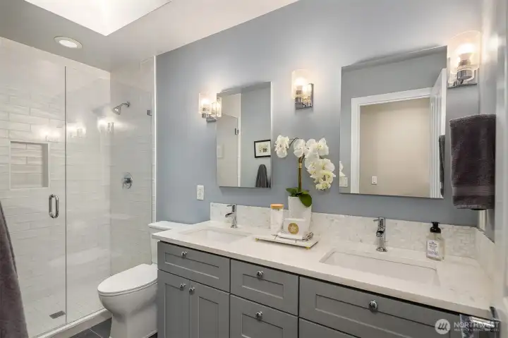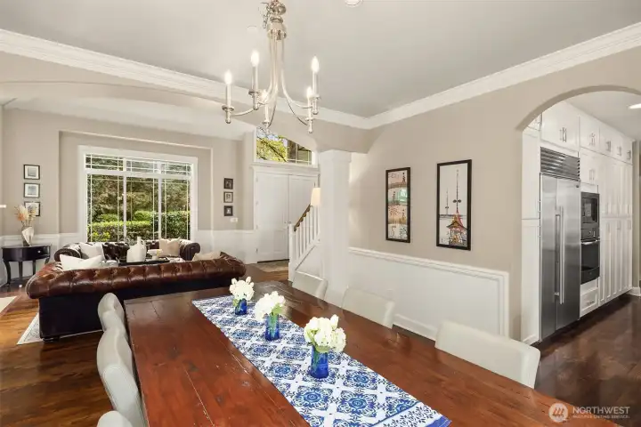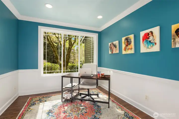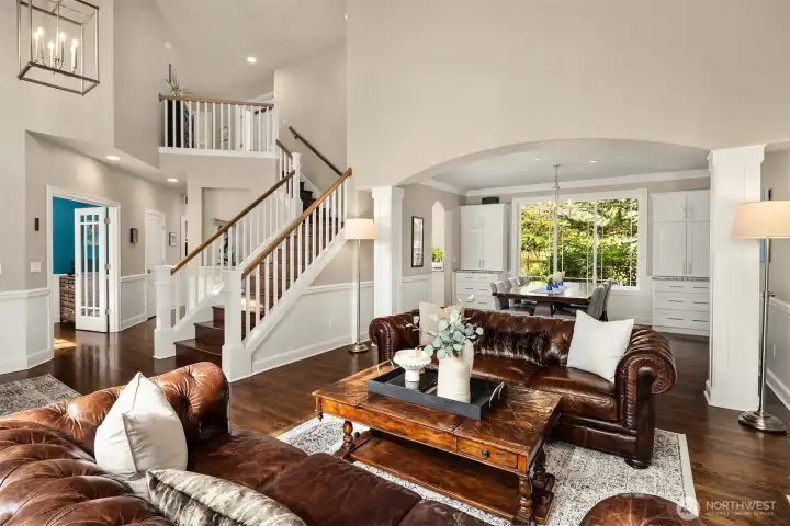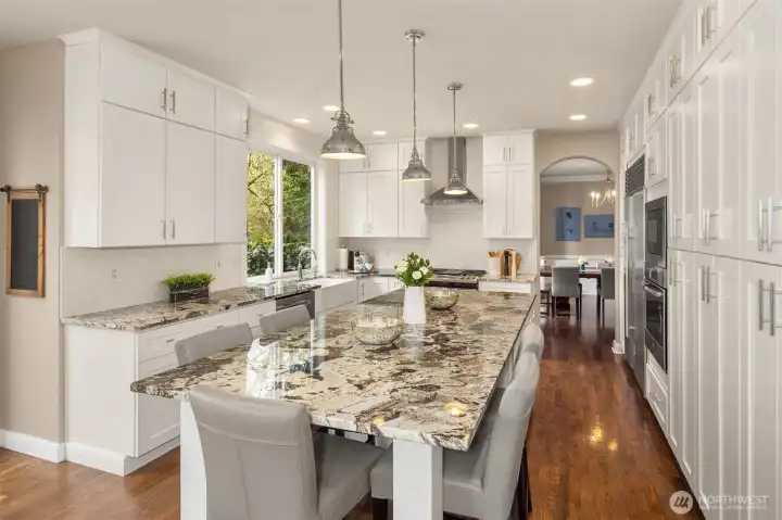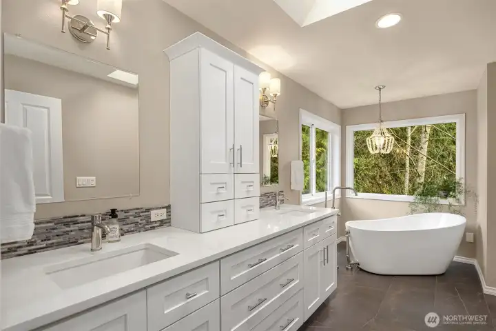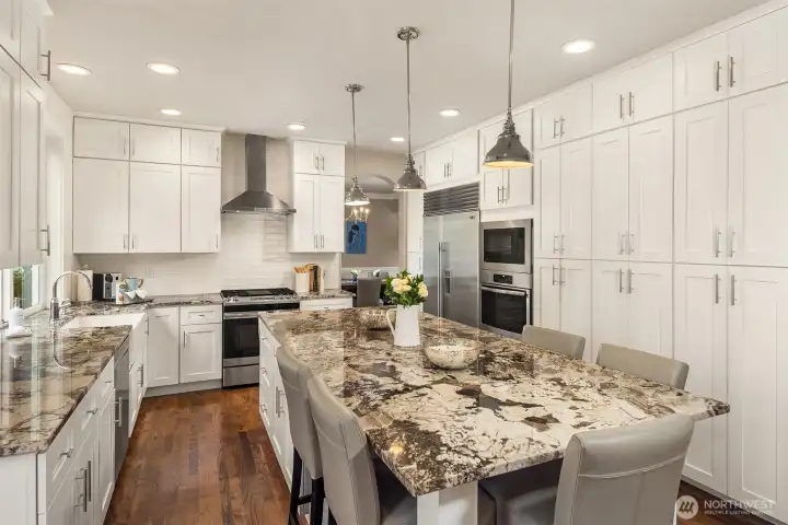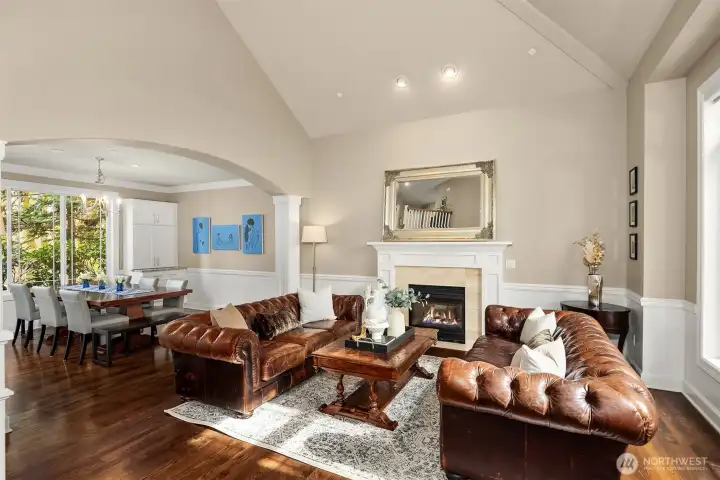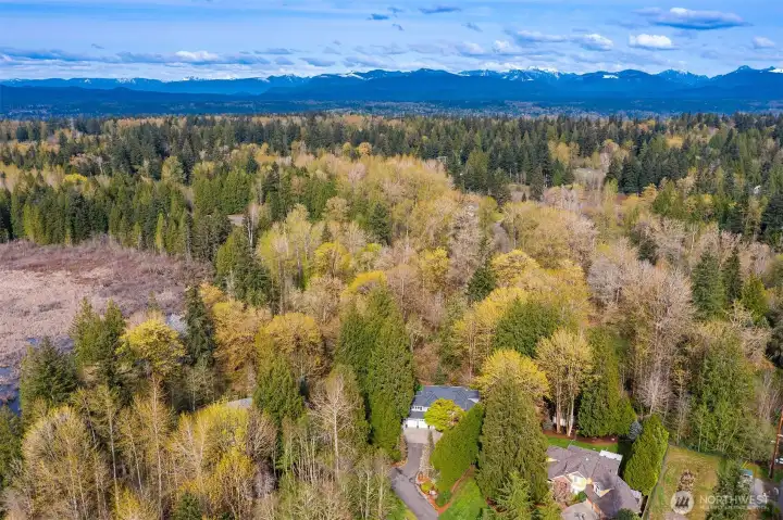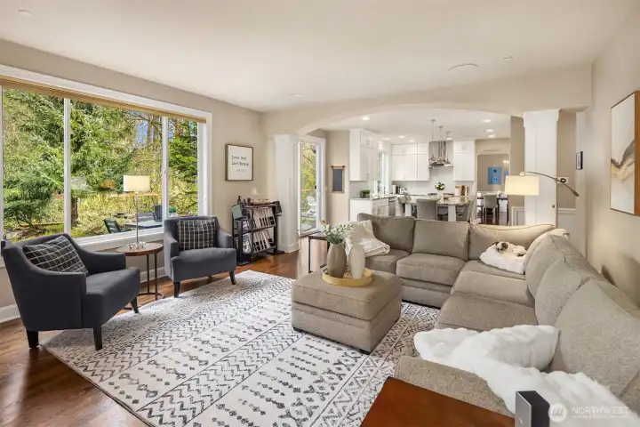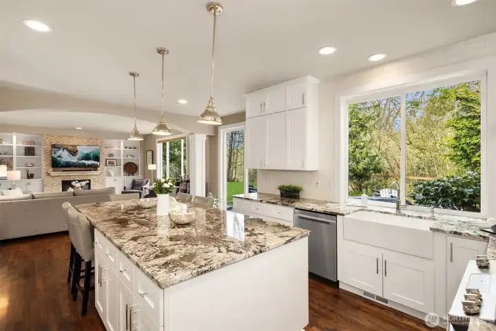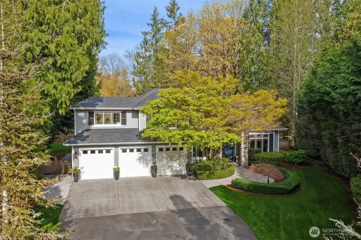 Set on a private cul de sac backing to protected wetlands with trail access to the water, this extensively updated residence offers a rare blend of natural beauty and refined, move in ready living. Surrounded by mature evergreens, the setting provides exceptional privacy while remaining close to the best of the Eastside. Inside, soaring vaulted ceilings and expansive windows fill the home with natural light, highlighting a cohesive palette of updated hardwoods, crisp white millwork, designer lighting, and curated hardware. The fully renovated kitchen serves as a central gathering space, featuring granite surfaces, shaker cabinetry, stainless steel appliances, and a Sub Zero refrigerator, opening seamlessly to generous living and dining areas anchored by a tiled gas fireplace with custom built ins. A flexible main floor den adds functionality for work or retreat, while the primary suite offers a quiet escape with a beautifully updated bath including custom cabinetry and a freestanding soaking tub. Additional baths reflect the same timeless finishes. The fully fenced backyard creates a private outdoor setting with garden beds, fire pit seating, and mature landscaping, all framed by a tranquil natural backdrop. With new interior and exterior paint, cement board siding, and extensive updates throughout, this home presents a rare opportunity to enjoy privacy, quality, and connection to nature in a premier Eastside location.