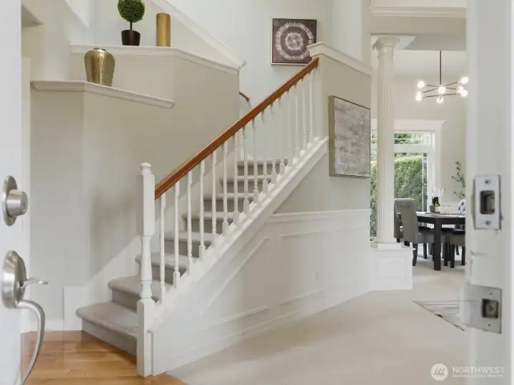 Large formal living and dining to the right of the front door are perfect for hosting gatherings