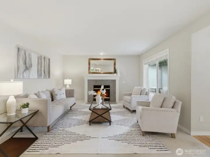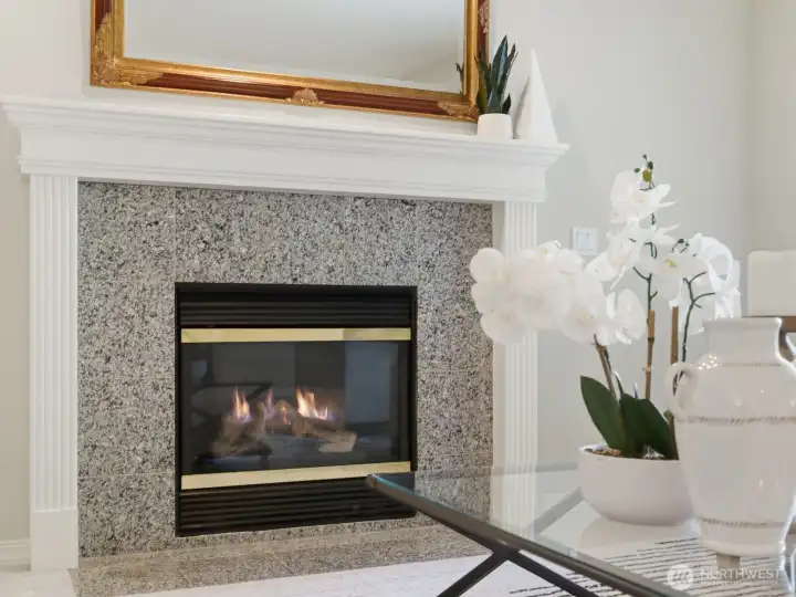 Another set of French doors lead to a more casual living area with a cozy gas fireplace
