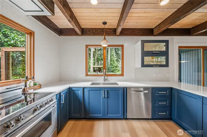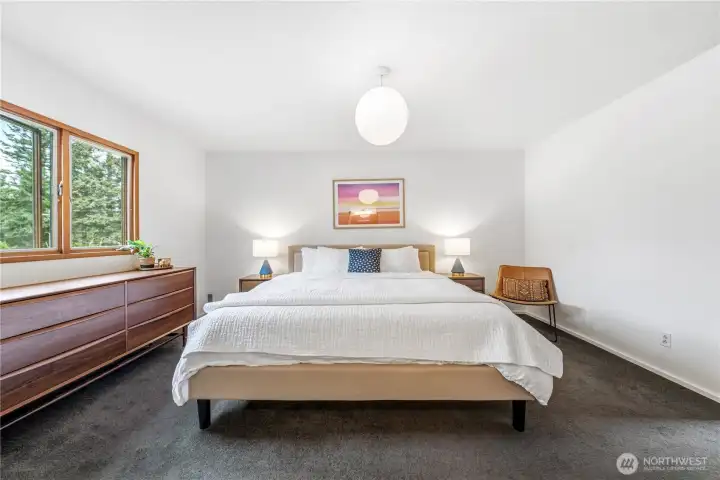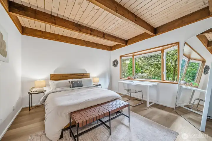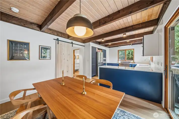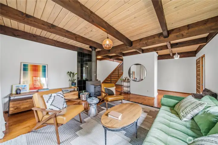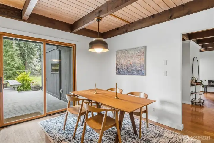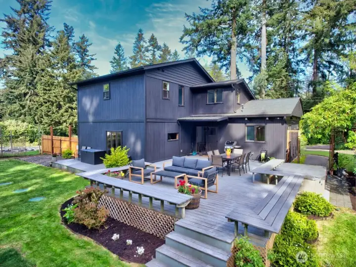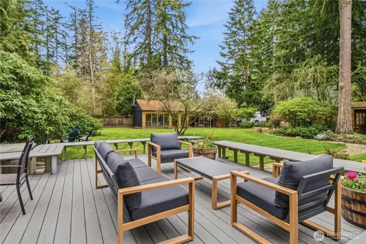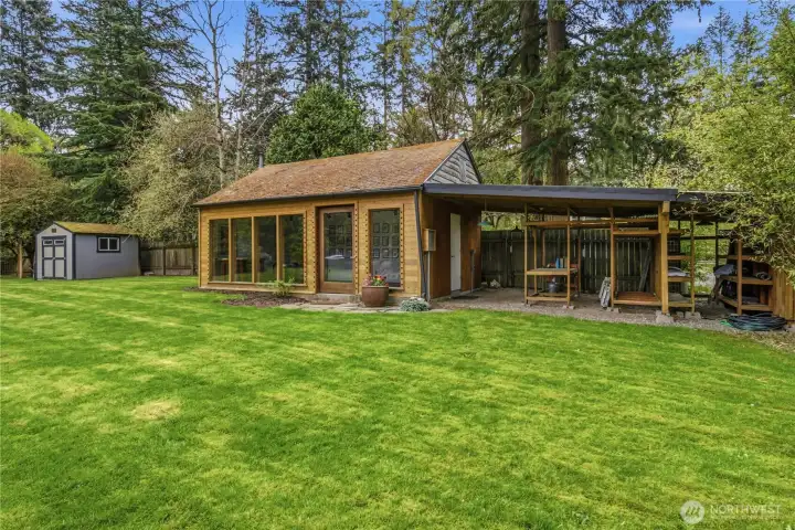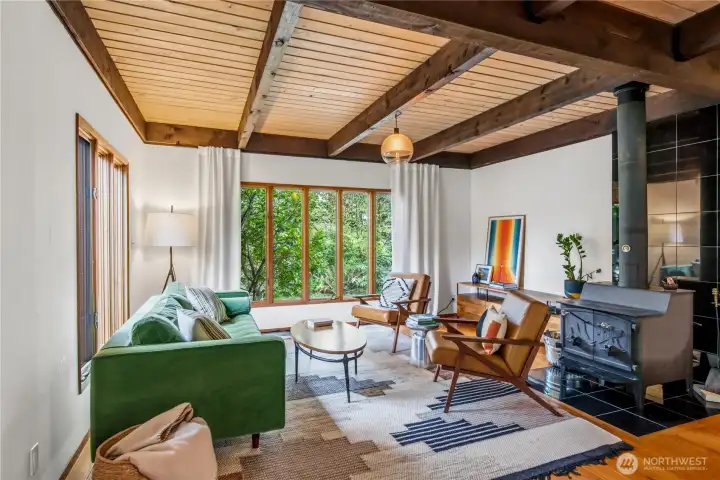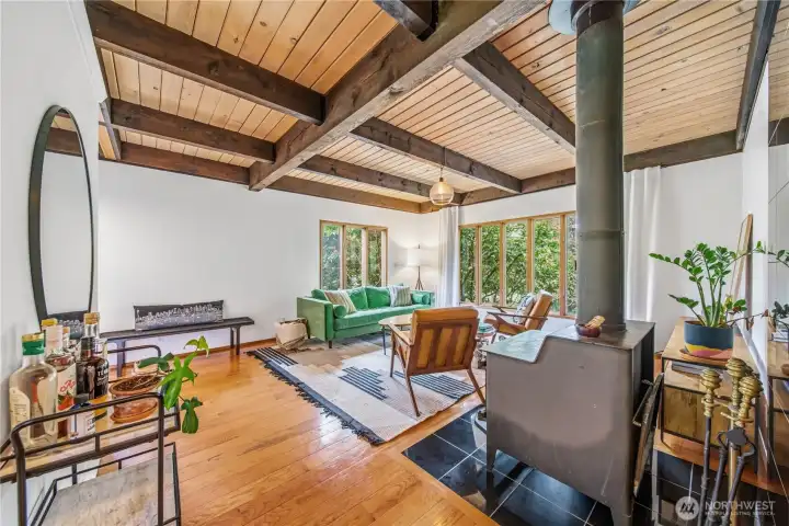 Mid-century modern Vashon retreat blending island living with elevated design. This 3 bed, 3 bath home offers 2,380 sq ft is in immaculate condition with vaulted wood beamed ceilings, warm architectural lines, and seamless indoor-outdoor flow. Set on a large, private, park-like double lot surrounded by mature trees, curated landscaping, garden beds, and a fully fenced backyard. Entertain on the expansive deck or host grilling sessions and fireside chats at the covered backyard BBQ area. Relax in the hot tub on the back deck, and host friends weekends away with a private guest suite on the main floor. A detached studio features wood-burning stove and vinyl wood plank flooring. Ideal for creative space, gym or yoga, or whatever else you can dream up. The expansive kitchen features a chefs dream of counter space, built-ins, and high end appliances with in a well crafted design. Wake up each day in you large primary suite with spa bathroom and large closet with built-ins and head over to be inspired in your forest view office. Built for comfort, privacy, and connection to nature. Just minutes from the ferry to Seattle, local shops, dining, and all that Vashon has to offer. An exceptional balance of tranquility, style, and convenience. Homes like this don’t happen often.