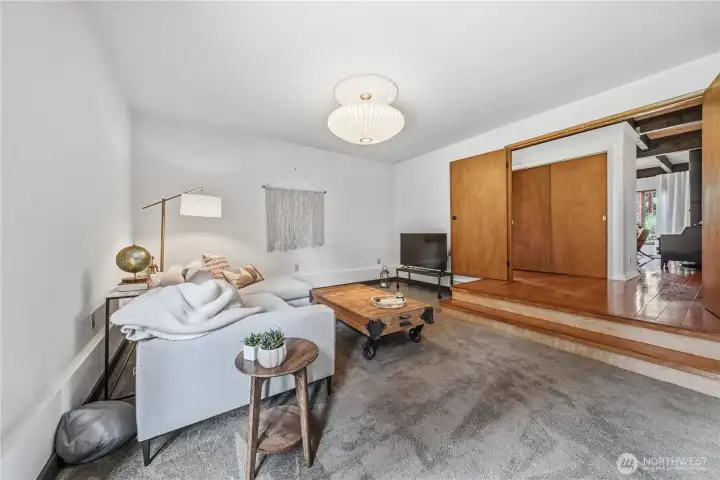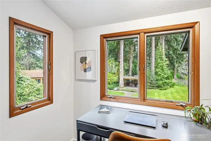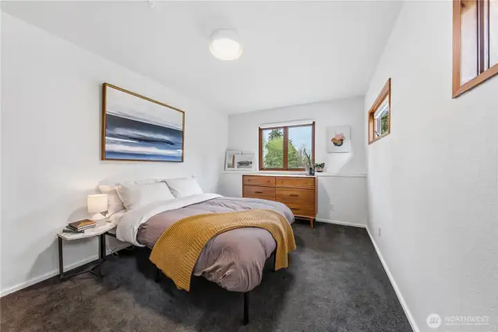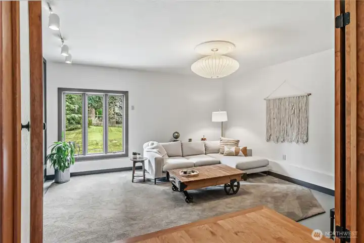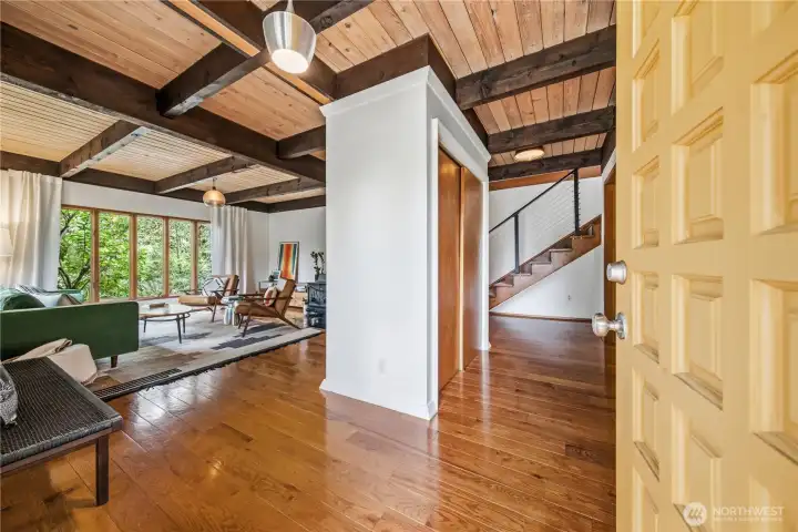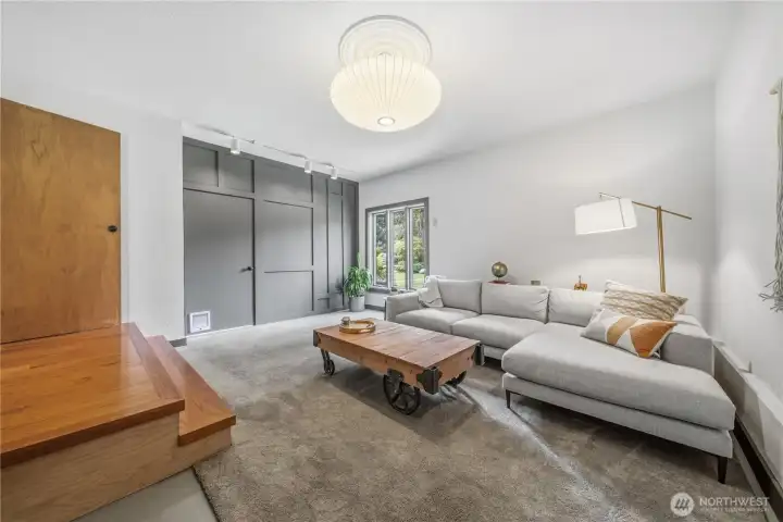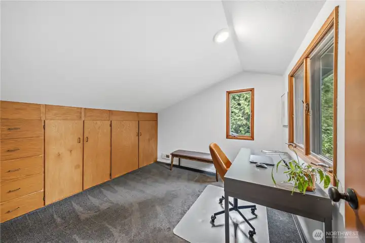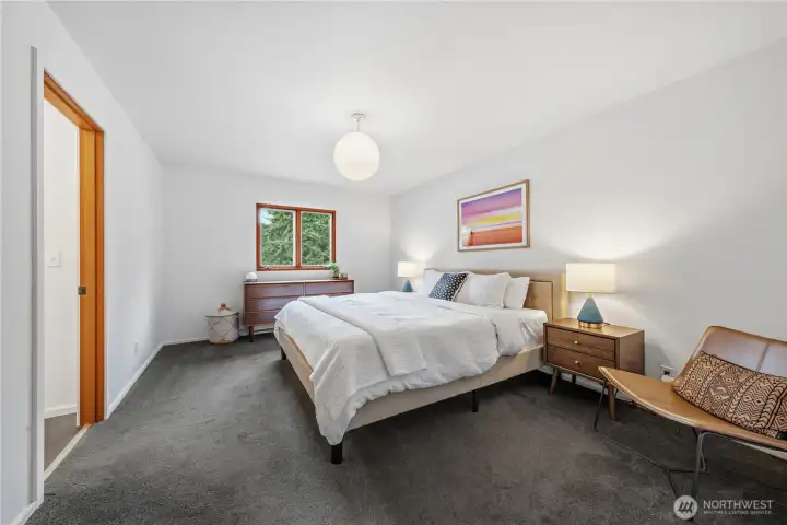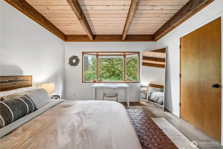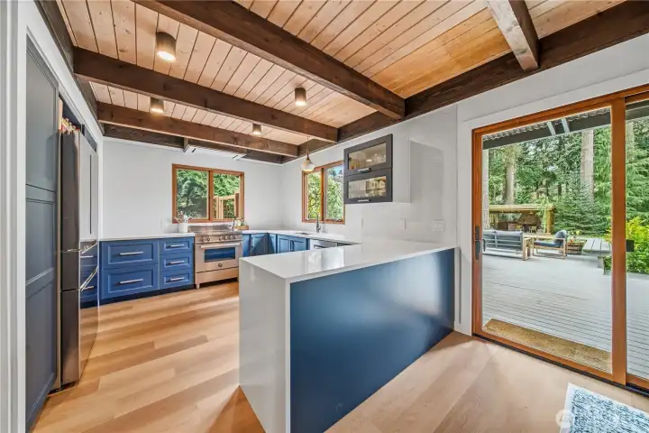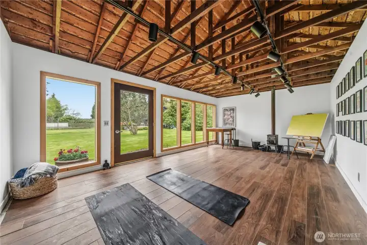 Mid-century modern Vashon retreat blending island living with elevated design. This 3 bed, 3 bath home offers 2,380 sq ft is in immaculate condition with vaulted wood beamed ceilings, warm architectural lines, and seamless indoor-outdoor flow. Set on a large, private, park-like double lot surrounded by mature trees, curated landscaping, garden beds, and a fully fenced backyard. Entertain on the expansive deck or host grilling sessions and fireside chats at the covered backyard BBQ area. Relax in the hot tub on the back deck, and host friends weekends away with a private guest suite on the main floor. A detached studio features wood-burning stove and vinyl wood plank flooring. Ideal for creative space, gym or yoga, or whatever else you can dream up. The expansive kitchen features a chefs dream of counter space, built-ins, and high end appliances with in a well crafted design. Wake up each day in you large primary suite with spa bathroom and large closet with built-ins and head over to be inspired in your forest view office. Built for comfort, privacy, and connection to nature. Just minutes from the ferry to Seattle, local shops, dining, and all that Vashon has to offer. An exceptional balance of tranquility, style, and convenience. Homes like this don’t happen often.