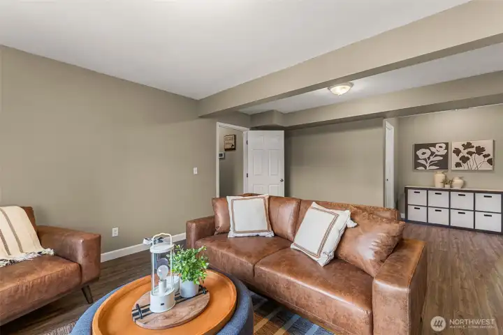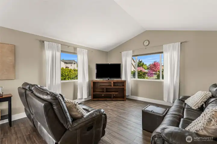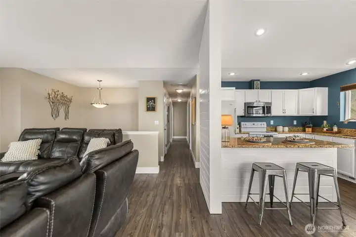 Welcome to this charming 3-bedroom split-level home filled with natural light and stylish luxury vinyl plank flooring throughout. The upper level features a private primary suite with an updated bathroom, showcasing a modern tile tub surround and dual vanity. The bright and inviting kitchen is accented with shiplap details, white cabinetry, and a blend of stainless and white appliances. An eating bar with granite countertops provides the perfect spot for casual dining while enjoying mountain views. Downstairs, you’ll find a spacious family room, full bathroom, and laundry area, along with convenient access to the garage—ideal for flexible living or entertaining. Step outside to a large upper deck with stairs leading to a fully fenced yard, complete with a lower-level deck, irrigation water, and a level area perfect for a future pool or outdoor retreat. With an efficient layout and a prime location near schools, parks, and shopping, this home offers both comfort and convenience.