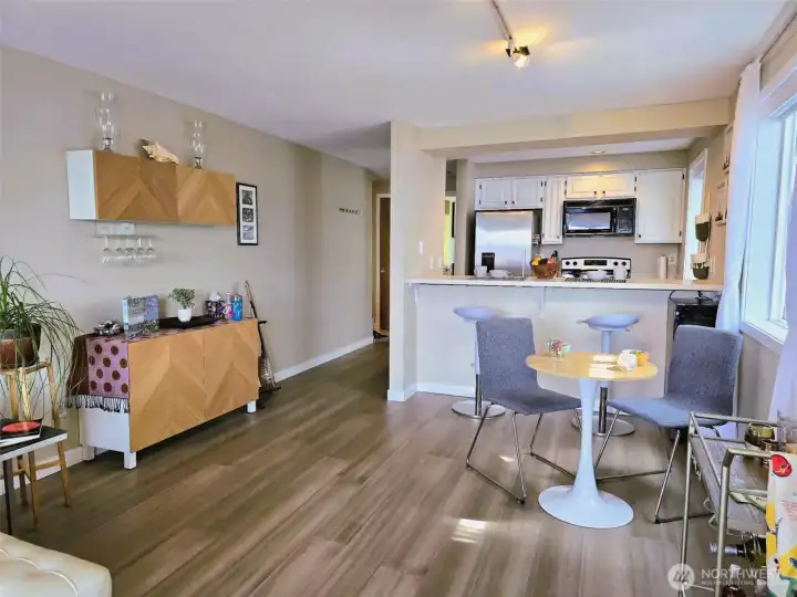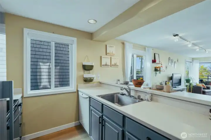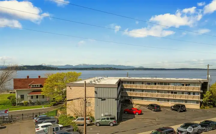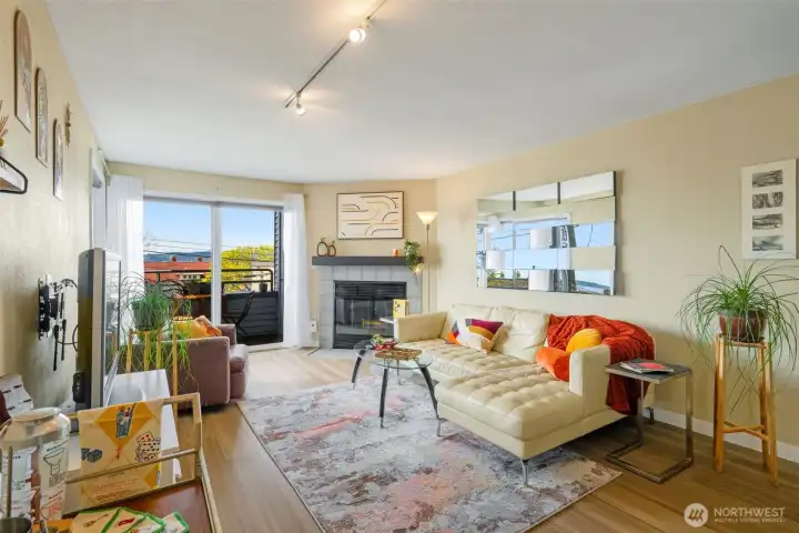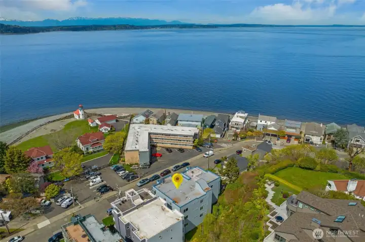 Soak in the sunshine, magnificent sunsets, and panoramic views of Puget Sound and the Olympic Mountains from your own waterfront retreat. Watch Orcas playing & the Downtown & West Seattle ferries pass by from the comfort of your deck, or stay inside and snuggle up by the fireplace on cooler coastal days. Ideally situated on a designated “Permanently Healthy” pedestrian street, this charming 2-bedroom, 1-bath home sits directly across from the iconic Alki Point Lighthouse and Coast Guard station. Just steps away, you can access the Constellation beach park for tide pooling, kayaking, and paddle boarding. Or simply enjoy the actual sandy beach, and it's breathtaking views. A short 5 min walk or 2 min bike ride North and you get a vibrant mix of restaurants, cafés, and shops. Hop on the nearby fast ferry for quick access to downtown Seattle. Live in one of the only buildings with nothing but greenspace behind it; where you know all of your neighbors, & function as a co-op without the issues of one. This unit lives larger than the sq ft. and offers a kitchen with lots of storage & a breakfast bar, a dining area and a large, bright living room with a wood burning fireplace, and your own deck! Recent updates include: new Bamboo floors, a brand new Amana range, a newer refrigerator, washer and dryer. A large private primary bedroom, the second bedroom has a very comfortable Murphy bed; ideal for guests, or a work-from-home setup. Building got a new torch down roof in 2025.