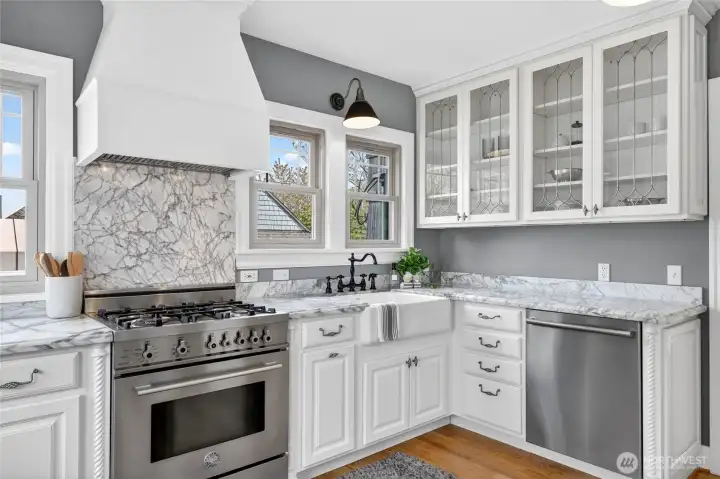 Gleaming marble countertops and tons of cabinetry to store all your kitchen gadgets plus gas range make this kitchen a dream come true for any cook. There's plenty of room for everyone to gather and help prepare meals together here!