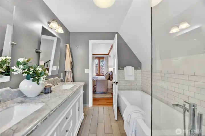 The gorgeous Primary 5-piece bath features free standing tub, double sinks and marble countertops.
