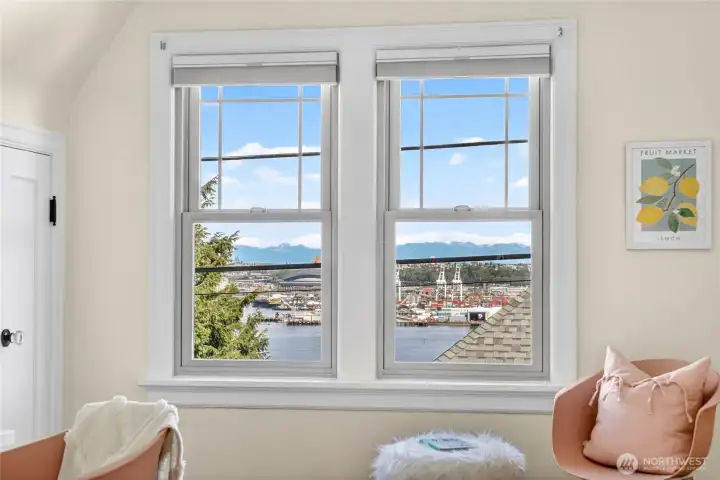 Spacious upstairs bedroom #2 has peek downtown Seattle, Cascade Mts and some water views.