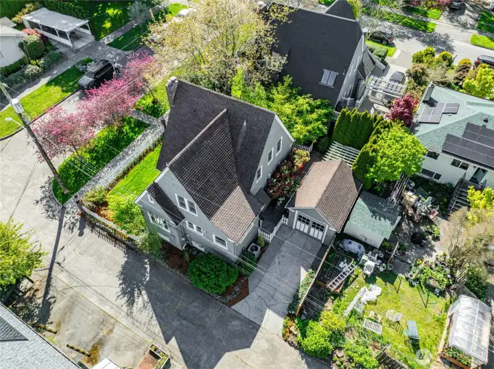 The garage is conveniently located off the alley. There is also an electric car charger to the left of the driveway