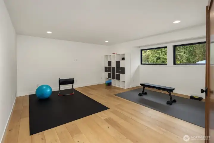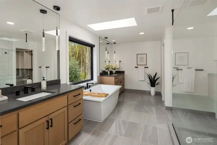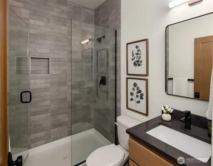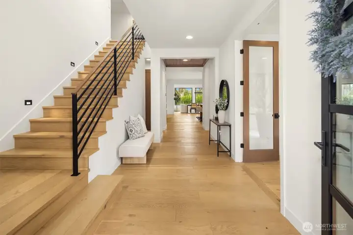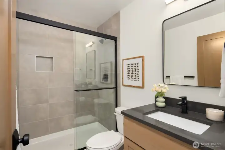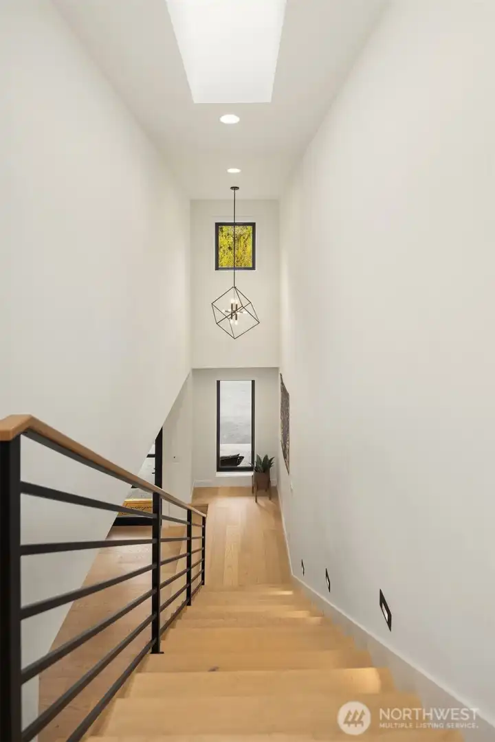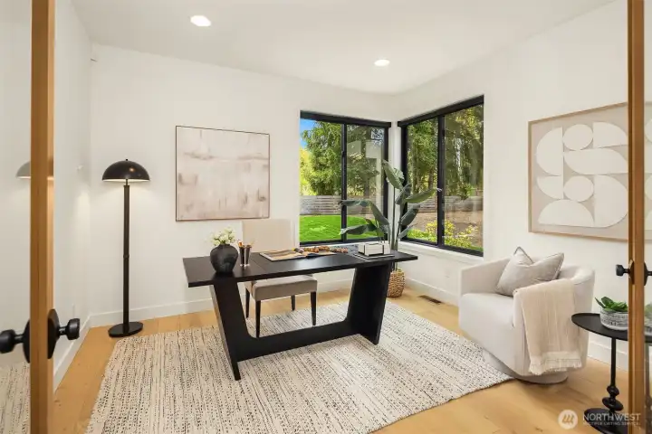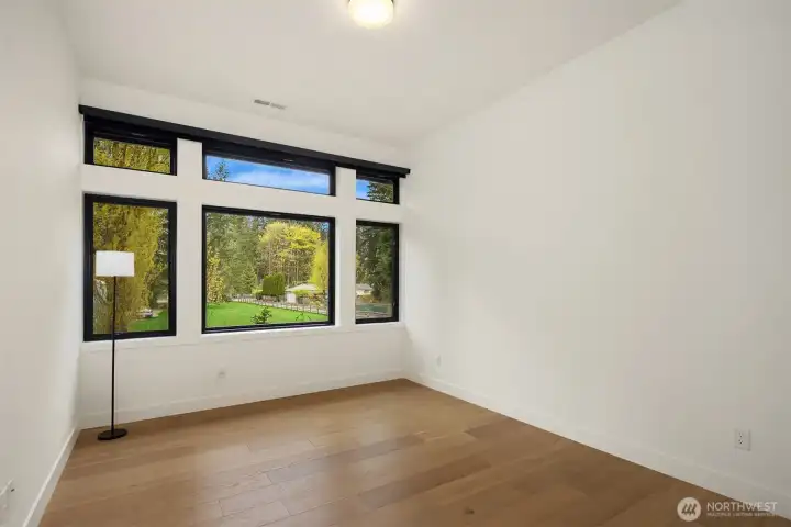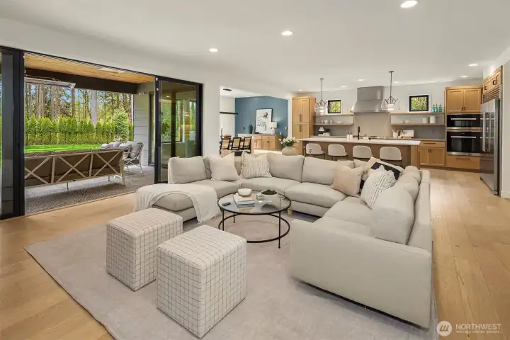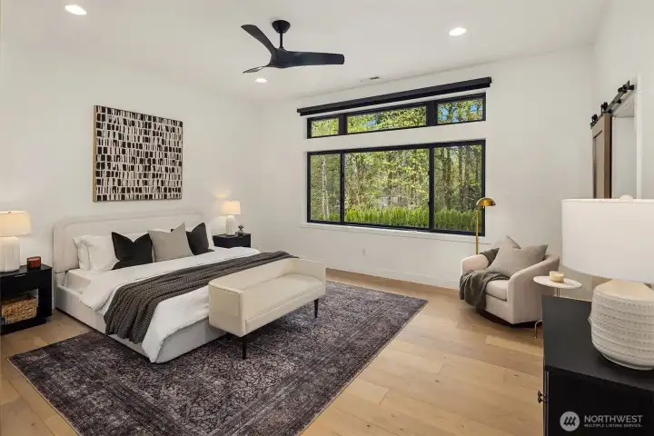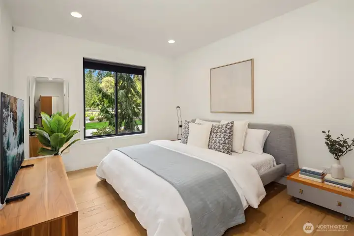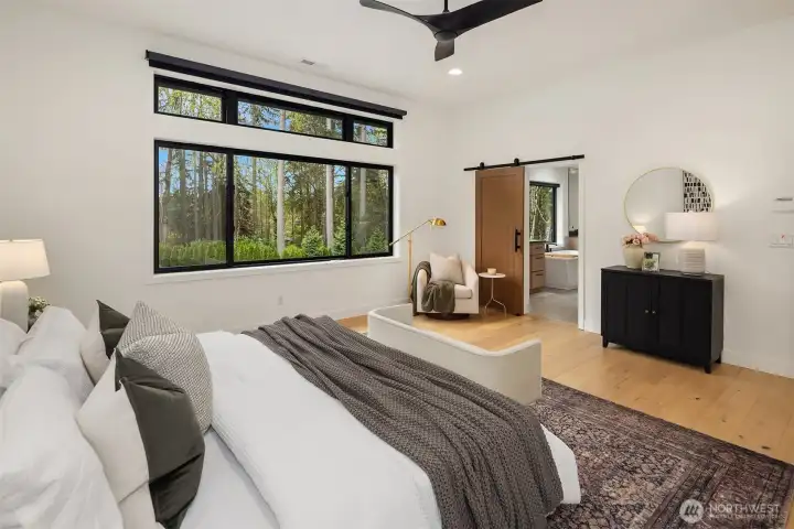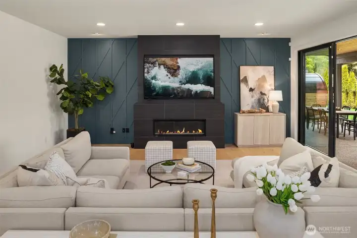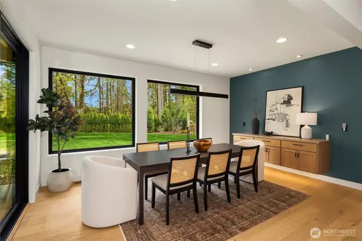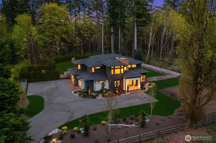 Contemporary design with a rare sense of privacy. Tucked at the end of a quiet lane and backing to a wooded greenbelt, this Woodinville residence offers a thoughtful blend of architecture, finish and livability. Light moves effortlessly through the home, highlighting clean lines, warm textures and a natural sense of flow. The main level is anchored by a beautifully composed great room with a custom millwork fireplace wall, opening to a well-appointed kitchen with quartz surfaces, custom cabinetry and premium Miele and Hestan appliances. A private den and main floor guest suite provide flexibility for work and extended stays. Upstairs, wide plank hardwoods lead to a media room and a serene primary suite with soaring ceilings and a spa-inspired bath featuring contemporary tile, an expansive walk-in shower and heated floors. Three additional bedrooms include one en suite plus a full hall bath. Outdoors, a fully fenced yard opens to natural surroundings, offering space to gather and unwind with covered living, heating, lighting and a sauna. Smart home features, EV charging, on-demand hot water and efficient systems complete this private and elevated offering. A rare opportunity to experience refined design, modern comfort and lasting privacy in one of Woodinville’s most desirable settings.