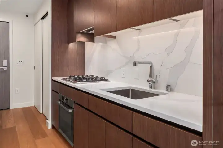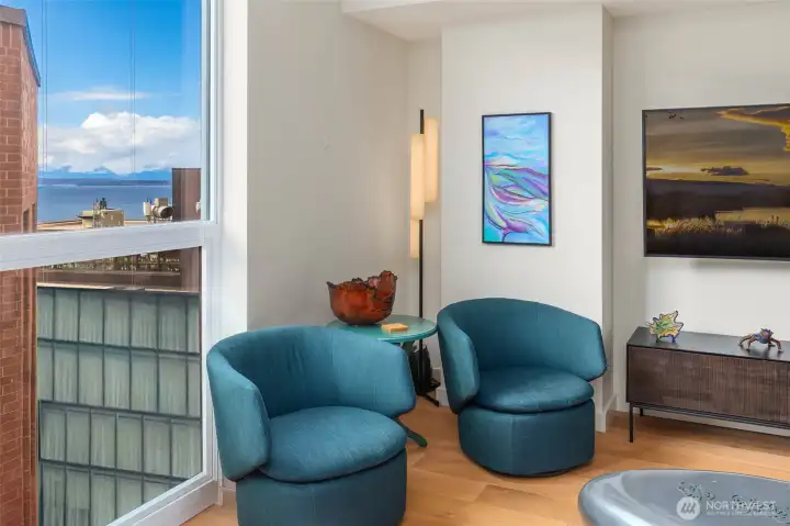 Your ultimate pied-à-terre awaits at The Emerald—one of downtown Seattle’s most sought-after luxury residences, perfectly positioned just moments from Pike Place Market, the waterfront, and world-class dining. This beautifully upgraded studio is designed to maximize both form and function, featuring a custom California Closet system, motorized shades, and a built-in bar that elevates everyday living. Floor-to-ceiling windows frame a western-facing exposure with partial, unobstructed views of the Puget Sound and Olympic Mountains, delivering unforgettable sunsets and abundant natural light. Enjoy breathtaking sunsets right from your home. The sleek kitchen is outfitted with integrated Bosch appliances, rich walnut cabinetry, and quartz countertops, all complemented by warm oak wood flooring throughout. Residents enjoy access to a stunning rooftop terrace with panoramic city, water, and mountain views, creating an unparalleled setting for relaxation or entertaining. With easy access to light rail, public transit, and major downtown corridors, the entire city—and beyond—is at your fingertips. Positioned in the heart of it all, with Seattle set to take center stage for the 2026 World Cup, this home offers both immediate lifestyle appeal and long-term investment potential. Experience refined urban living in the center of it all.