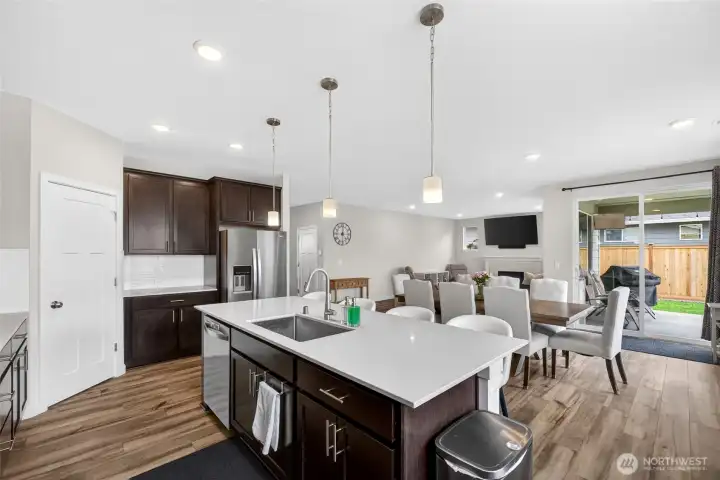 Chef's kitchen features a large center island, quartz countertops, cabinet lighting, built-in blue tooth speakers and a thoughtfully designed custom corner pantry